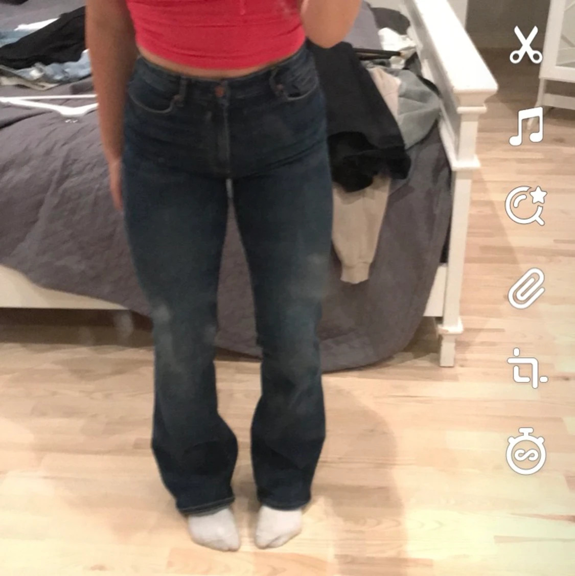 Snygga jenas mörk blå färg👌 strl 38 formar kroppen sjukt bra😍 använda få gånger tyvärr förstora för mig som är 34/36! Pris 120+frakt alternativt efter överenskommelse😁🥰❤️