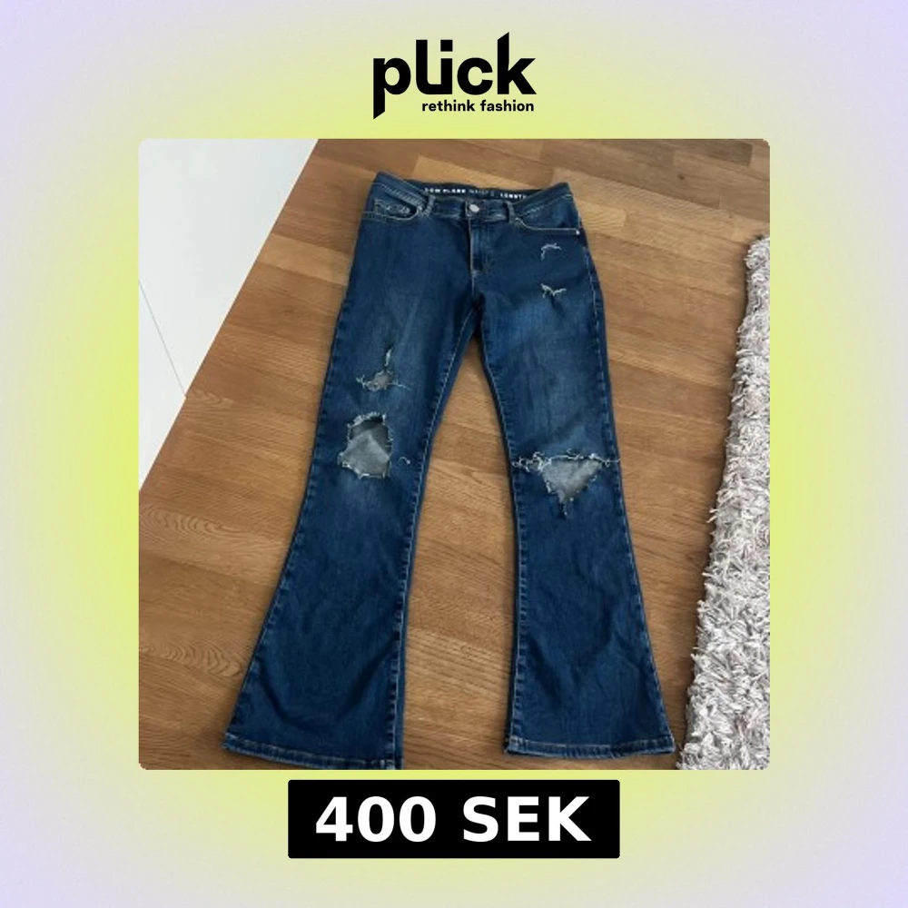 Säljer ett par blå bootcut jeans med tydliga slitningar och hål på benen. Jeansen har låg midja och klassisk femficksdesign. Perfekta för dig som gillar en avslappnad och trendig stil. Knappt använd 💗💗