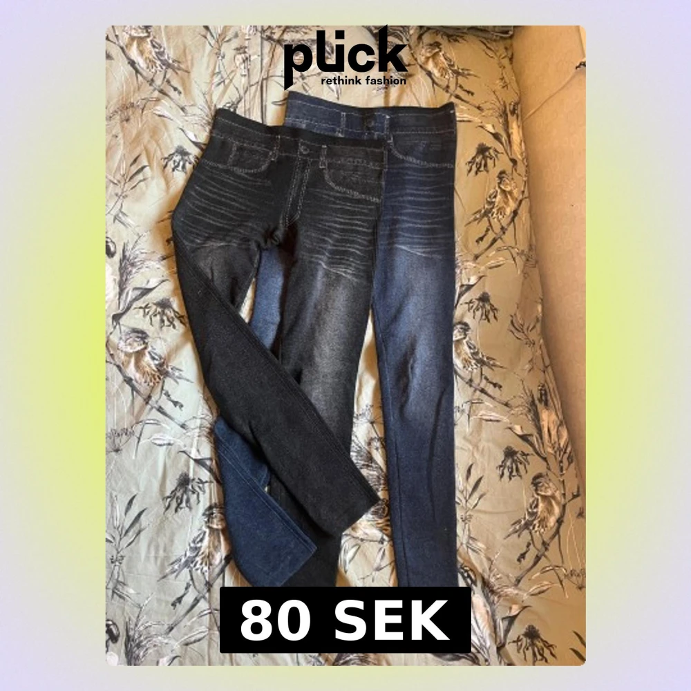 Säljer två par jeansleggings i skinny fit, ett par i mörkblått och ett i svart. Båda har fejkade fickor. Materialet är mjukt och stretchigt med viskos, polyester och elastan. Perfekt för dig som vill ha bekväma och snygga byxor.💞