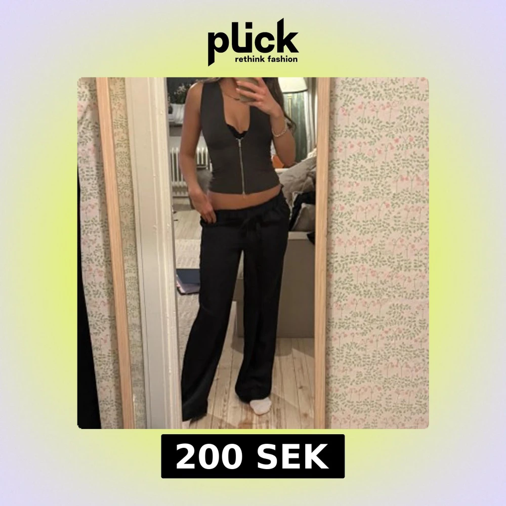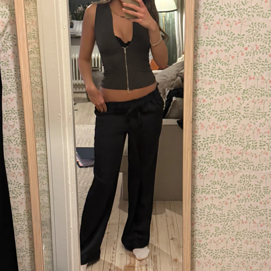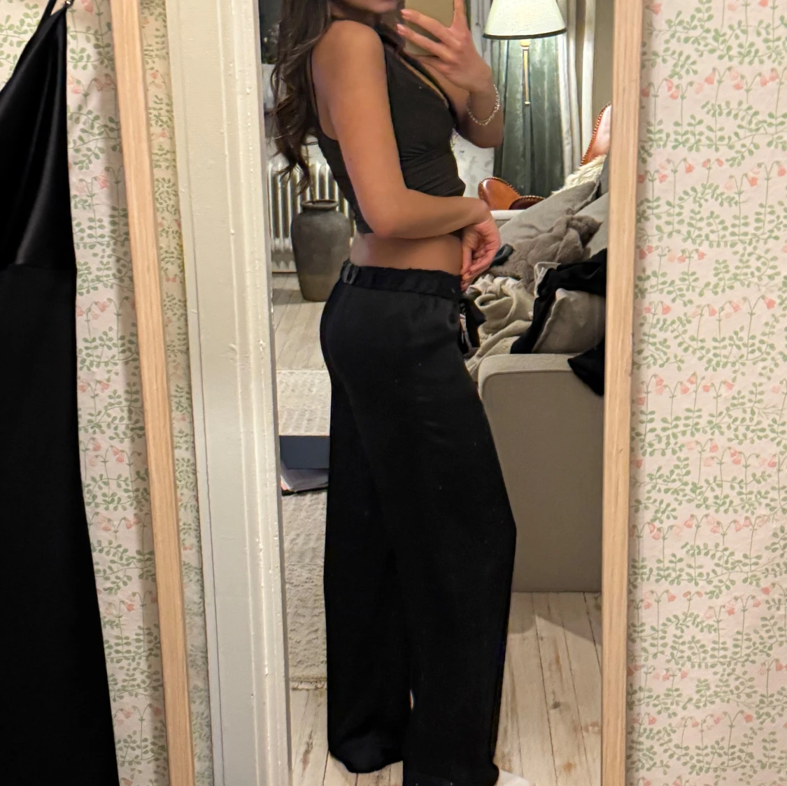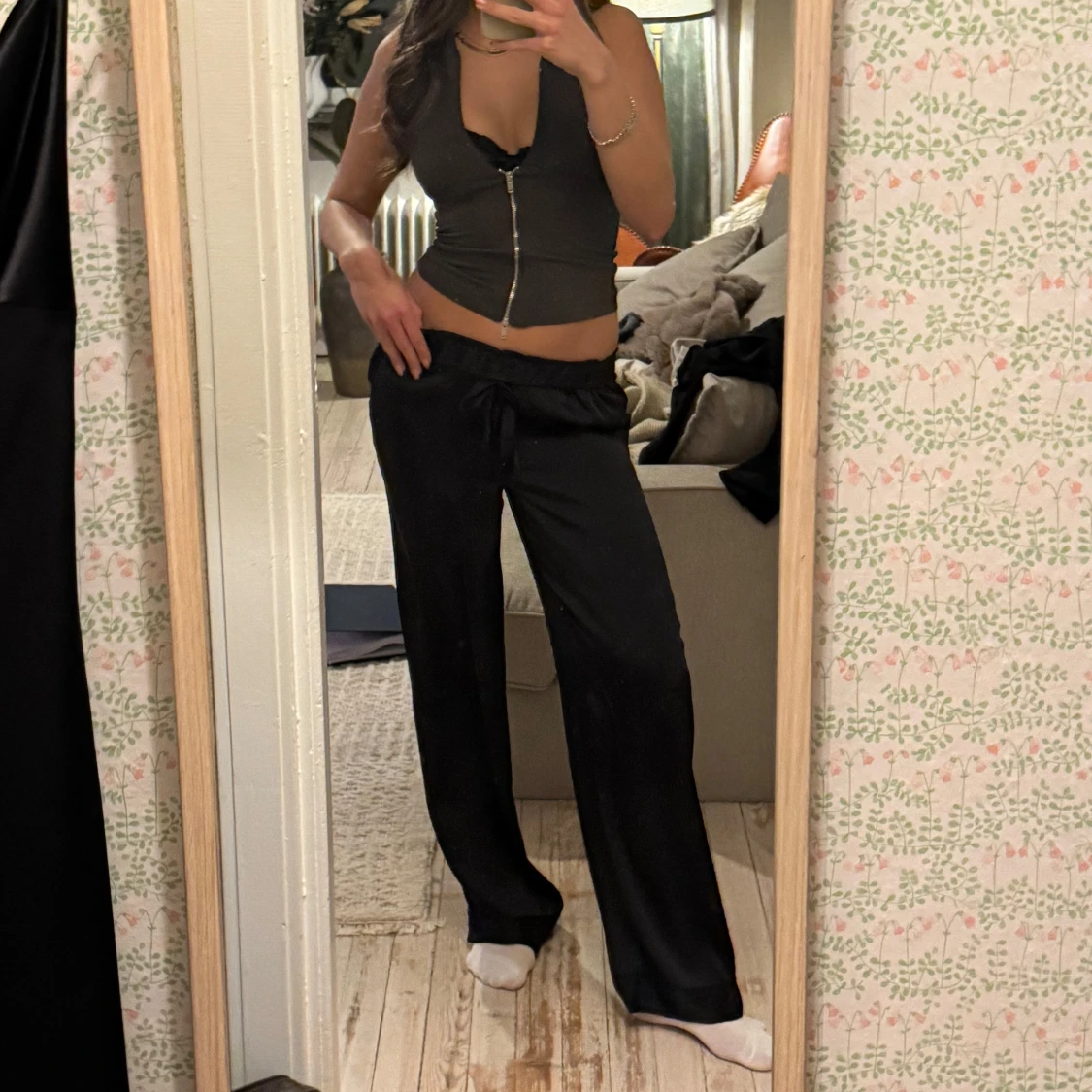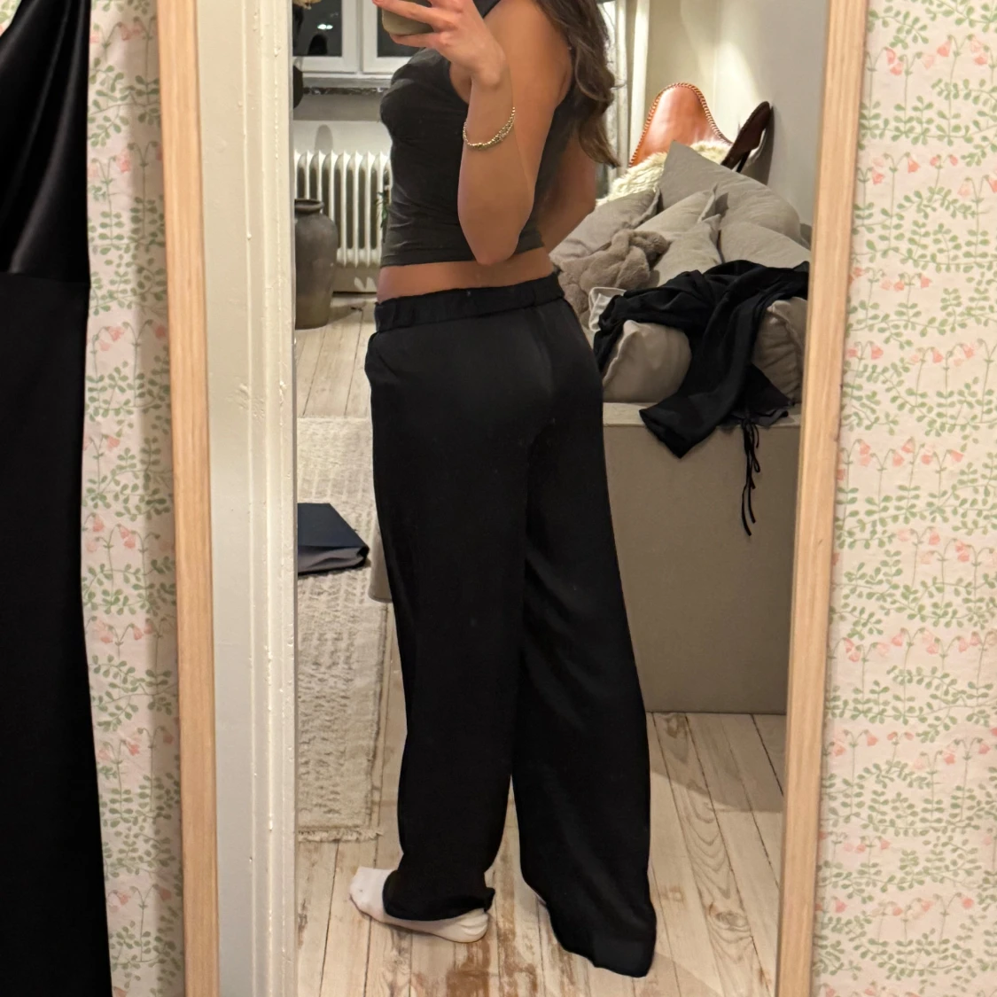 Säljer mina svarta silkes byxor!! Så snyggt att klä upp för utgång eller bara på med en svart skjorta flip flopps och en nice bh på sommarn. Jag är 165 cm och vanligtvis en S i byxor, de sitter super snyggt på mig!!