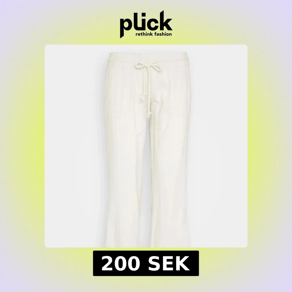 Säljer ett par vita linnebyxor från Roxy med avslappnad passform och dragsko i midjan. Byxorna har raka ben och stora fickor framtill. Perfekta för varma dagar och enkel stil. Skriv för fler bilder! De har blivit lite smutsiga och lite slitna nertill i benen då de varit lite för långa på mig. Därav priset 🤍Passar någon mellan 160-170!
