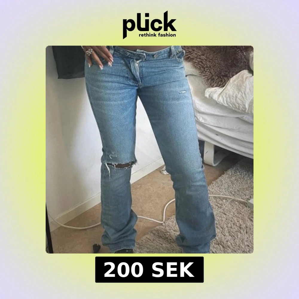 Säljer ett par blåa lågmidjade jeans med bootcut. Jeansen har ett tydligt hål på ena knät och slitningar vid fickor och lår. Jag är 165