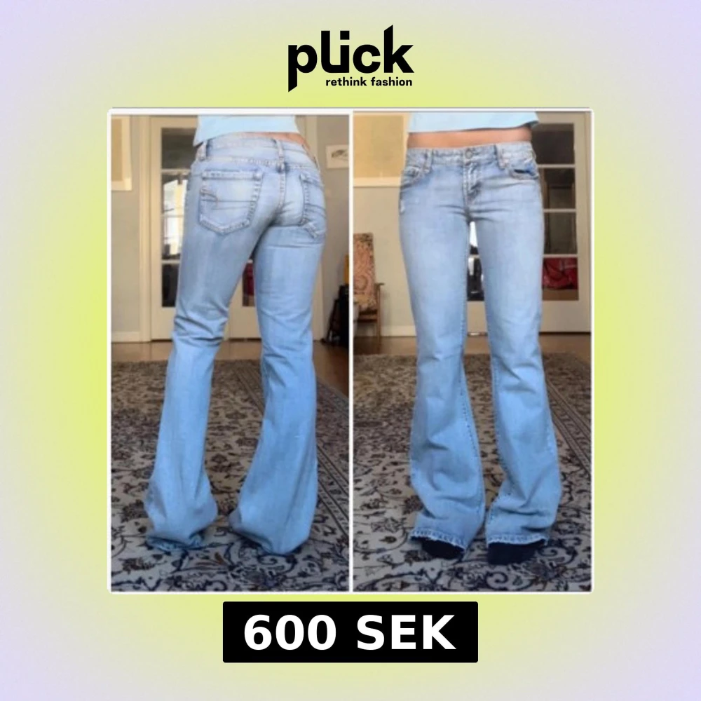 Så snygga lågmidjade bootcut jeans från american eagle. Står ingen storlek men jag skulle säga att de passar S. Midjemåttet är 37cm tvärs över och innebenslängden är 83cm💗💗💗💗💕
