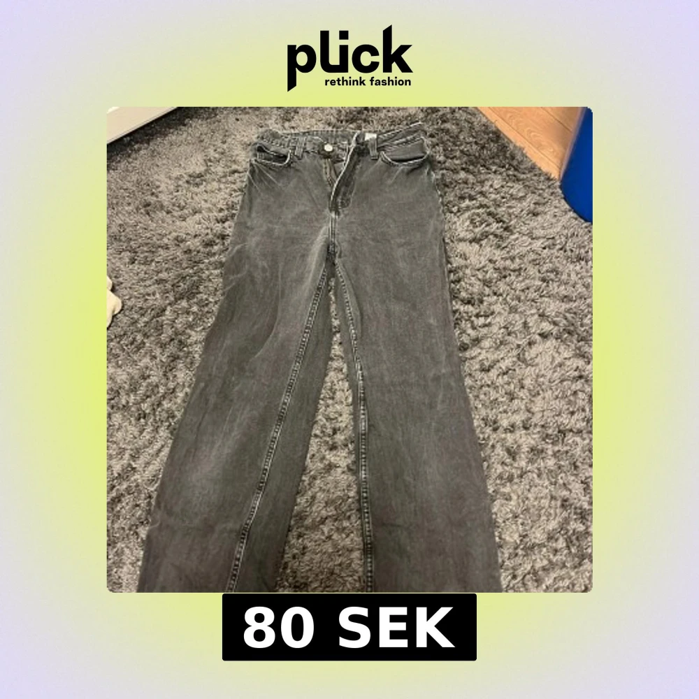 Säljer ett par grå jeans med vida ben och hög midja. De har en klassisk femficksdesign och stängs med dragkedja och knapp. Perfekta för en avslappnad stil.
