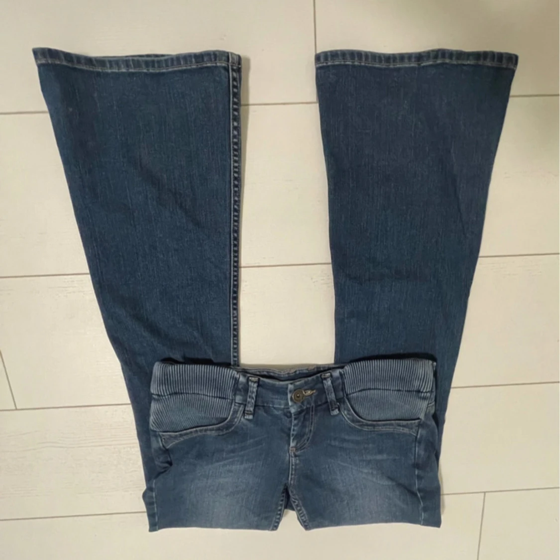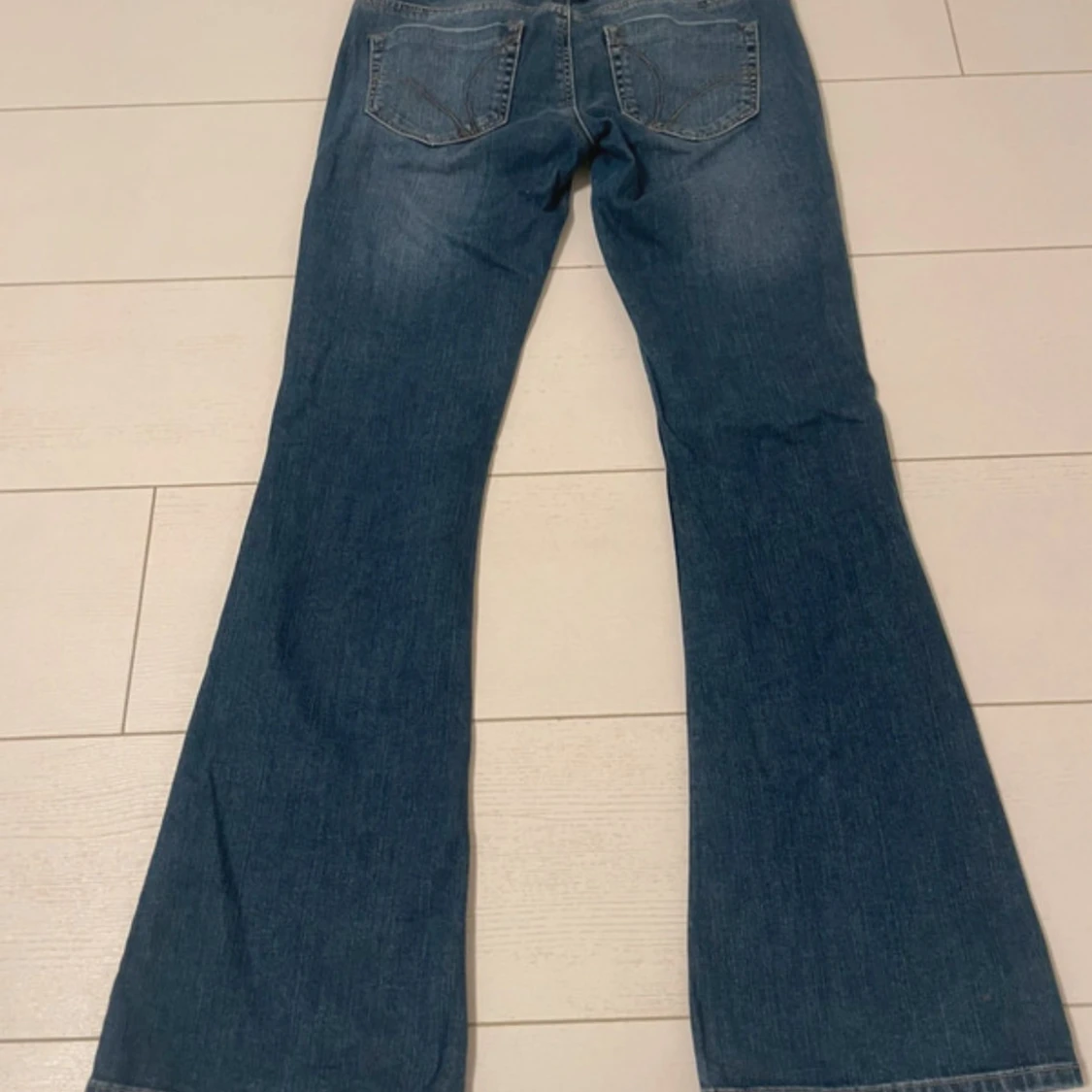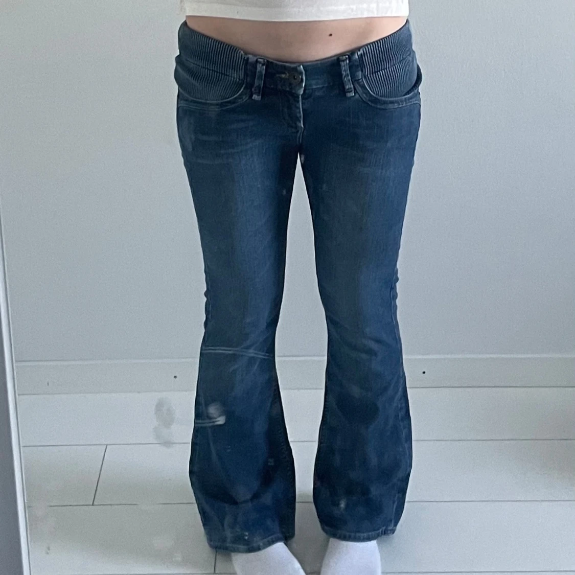 Säljer ett par blå bootcut jeans med unika randiga detaljer vid fickorna och midjan. Jeansen har klassisk femficksdesign, knapp- och dragkedjestängning samt normal passform. Perfekta för dig som vill ha en cool och avslappnad stil.