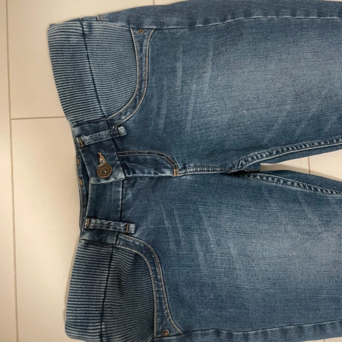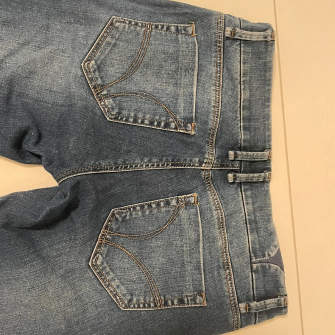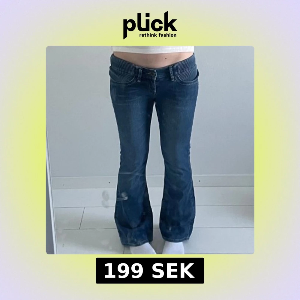Säljer ett par blå bootcut jeans med unika randiga detaljer vid fickorna och midjan. Jeansen har klassisk femficksdesign, knapp- och dragkedjestängning samt normal passform. Perfekta för dig som vill ha en cool och avslappnad stil.