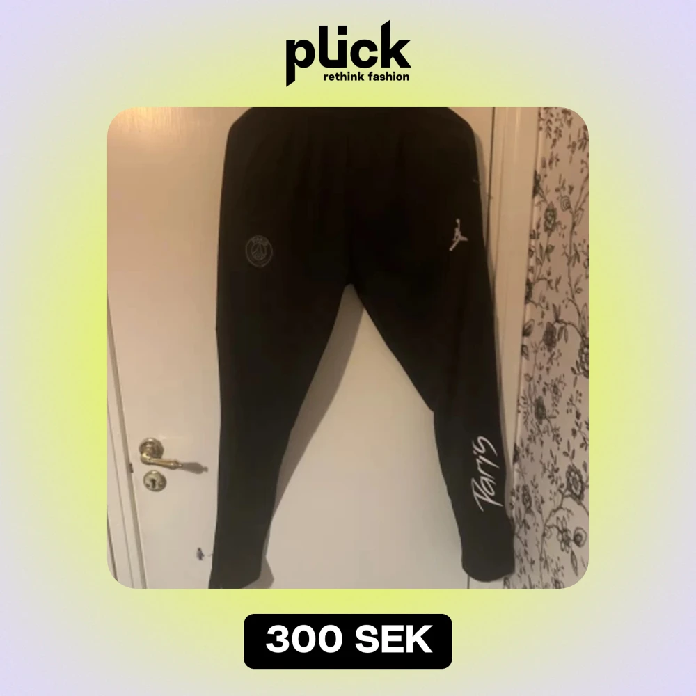 Säljer ett par svarta mjukisbyxor med Paris Saint-Germain-logga och Jumpman-märke. Byxorna har en avslappnad passform och är perfekta för både träning och chill. De har elastisk midja och är gjorda i ett mjukt material för extra komfort. På ena benet står det 'Paris' i vit text.