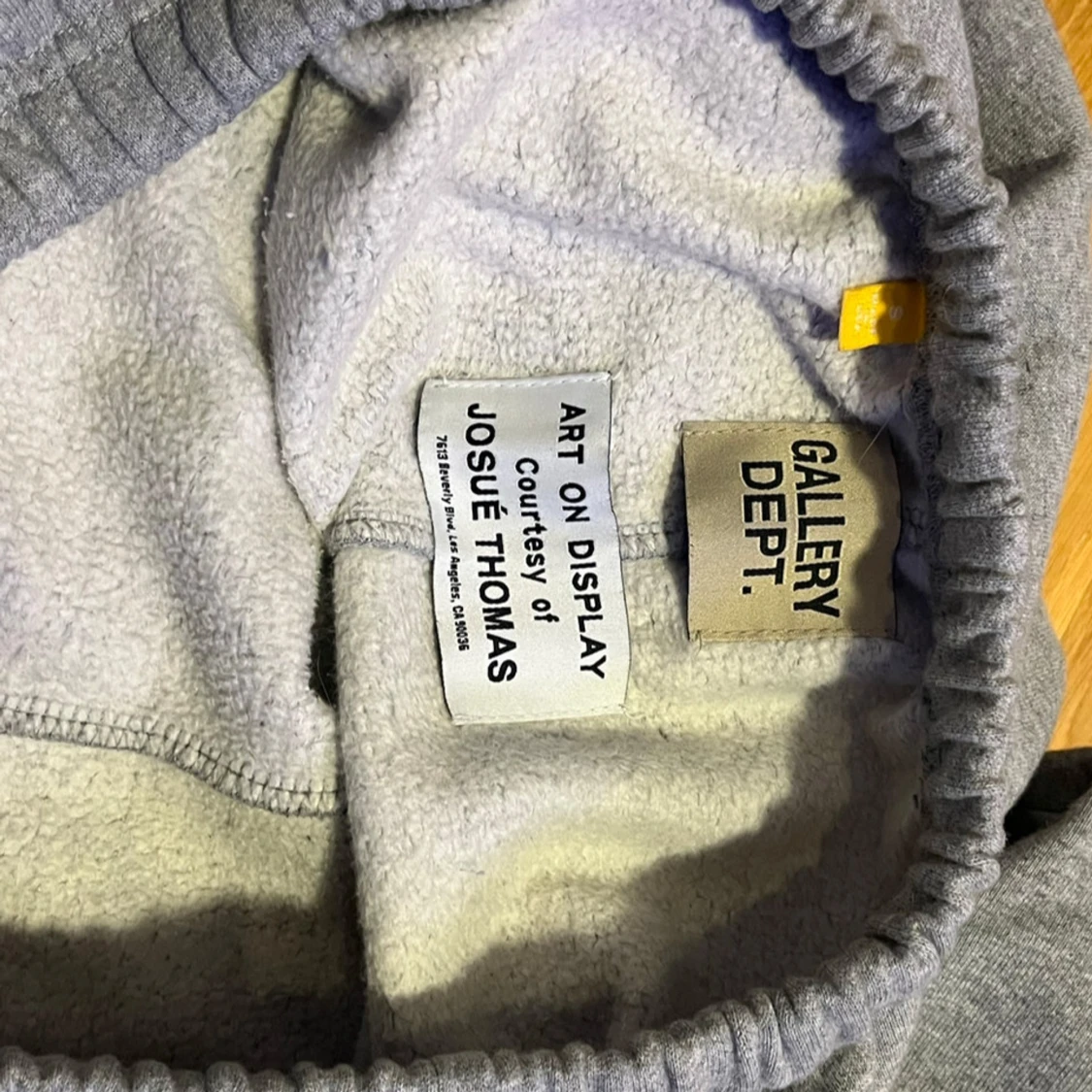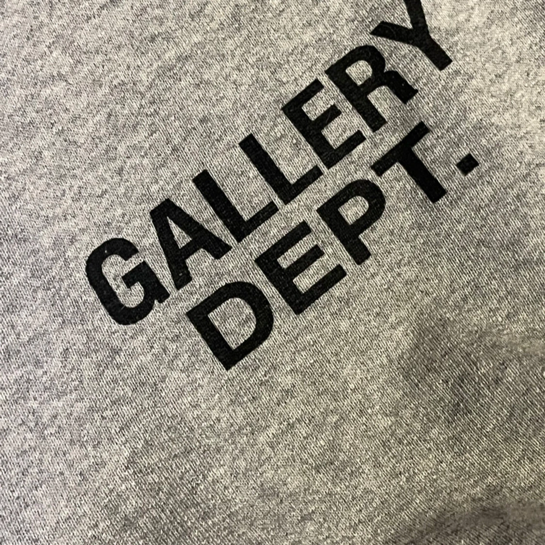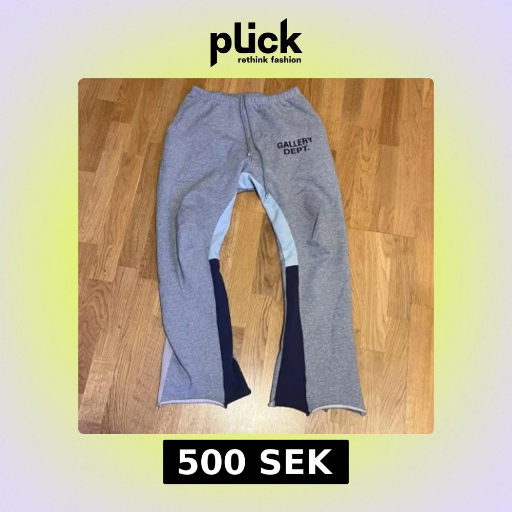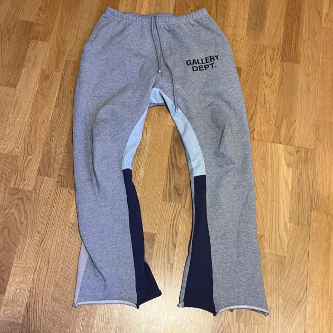 Grå mjukisbyxor från Gallery Dept. med svart logga på ena benet. Byxorna har elastisk midja med snörning och coola kontrastpaneler i ljusblått och mörkblått längs benen. Mjukt fleecetyg på insidan för extra komfort.