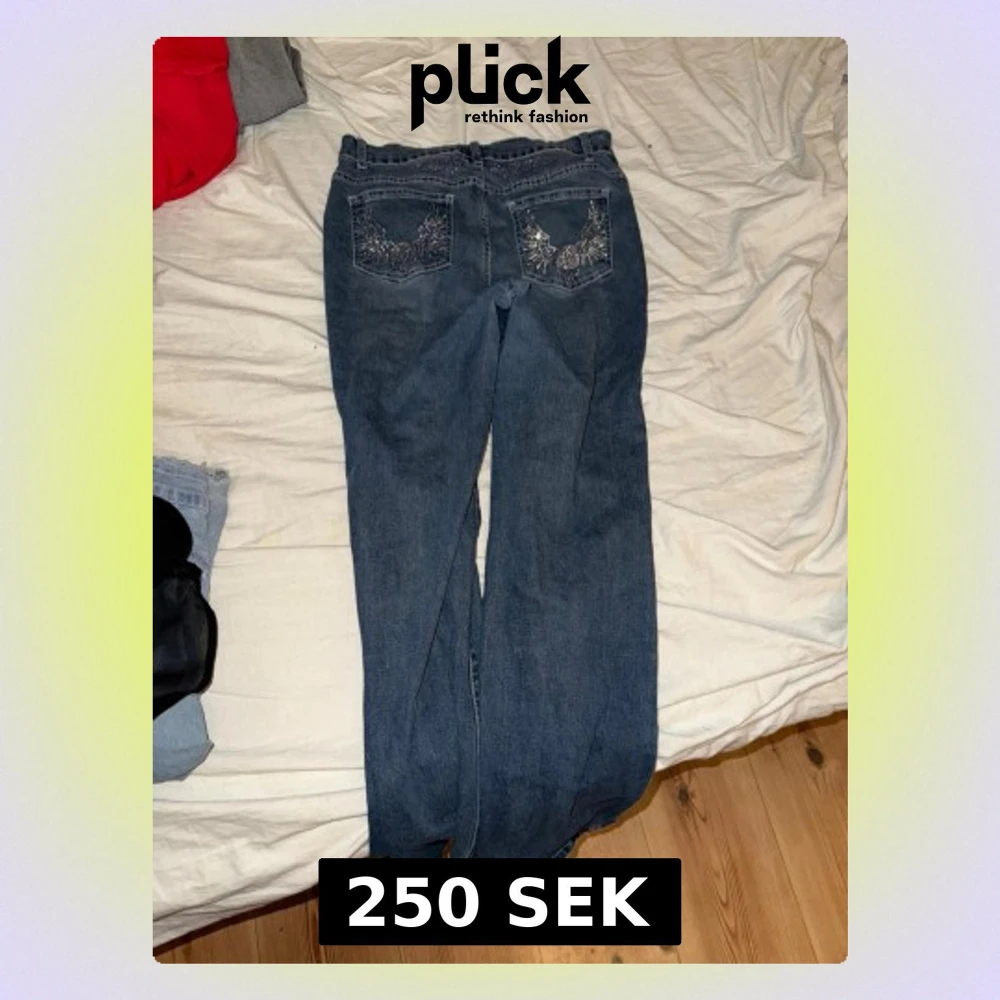 Snygga blå bootcut jeans från Romwe i storlek S. Jeansen har klassisk femficksdesign och coola detaljer med glittriga broderier på bakfickorna. Perfekt passform med normal midja och tillverkade i mjukt jeansmaterial.