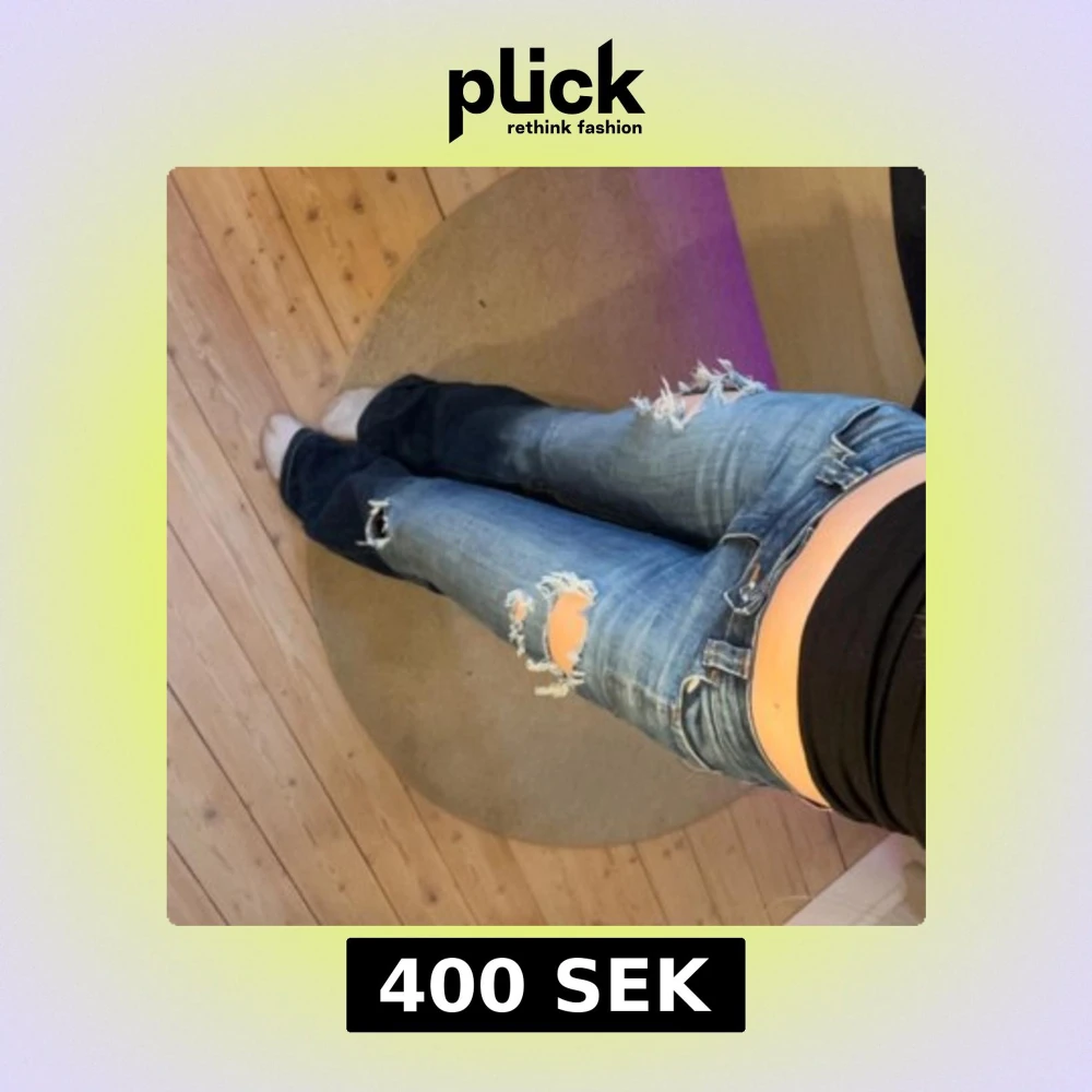 lågmidjade bootcut jeans med slitningar och hål på låren och knäna. de är även slitningar på ena bakfickan