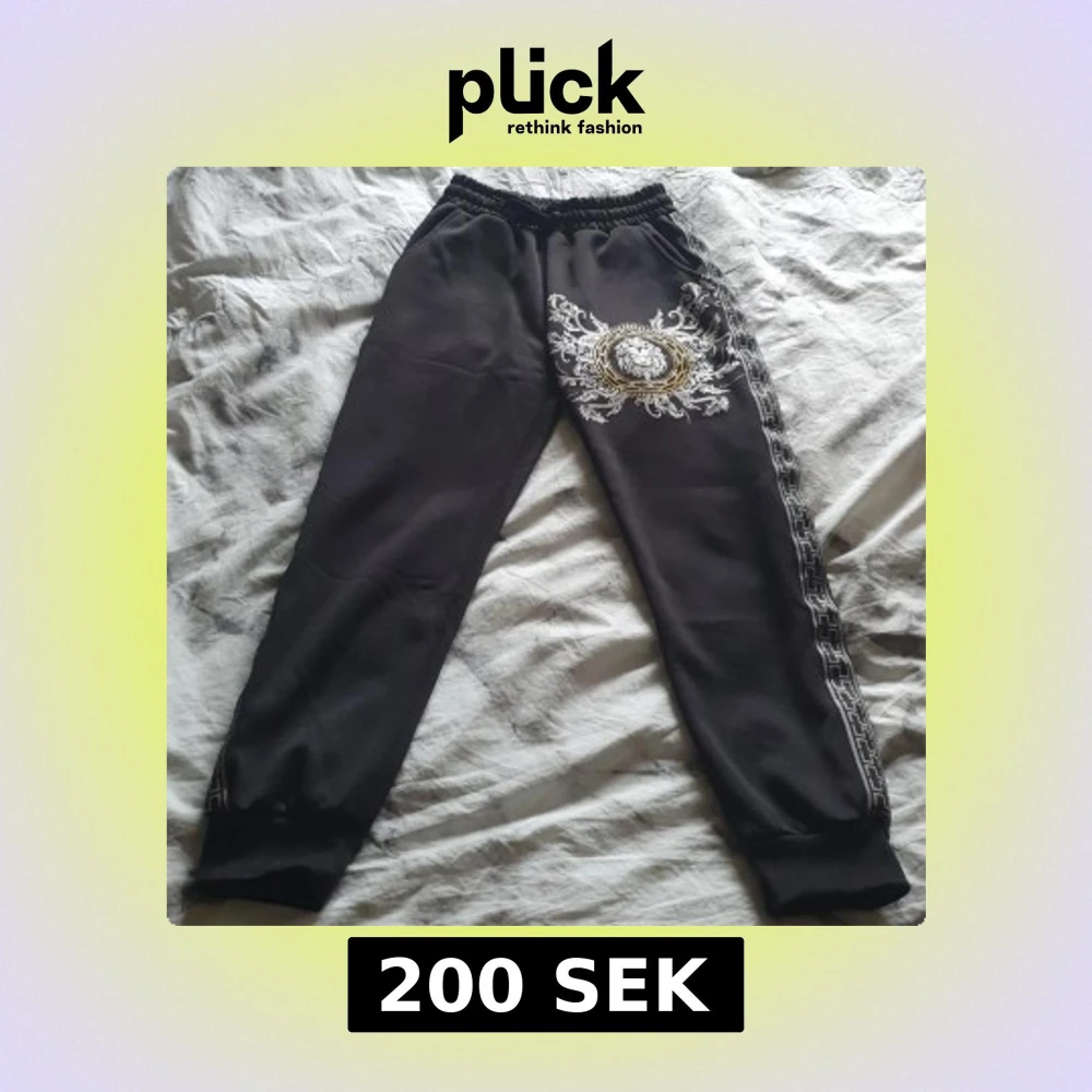 Svarta mjukisbyxor från TA Fashion i storlek S med elastisk midja och ribbade muddar. Snyggt lejontryck i guld och vitt på ena benet samt dekorativt mönster längs sidorna. Mjukt material och en bakficka för extra stilpoäng.