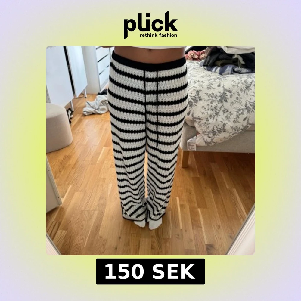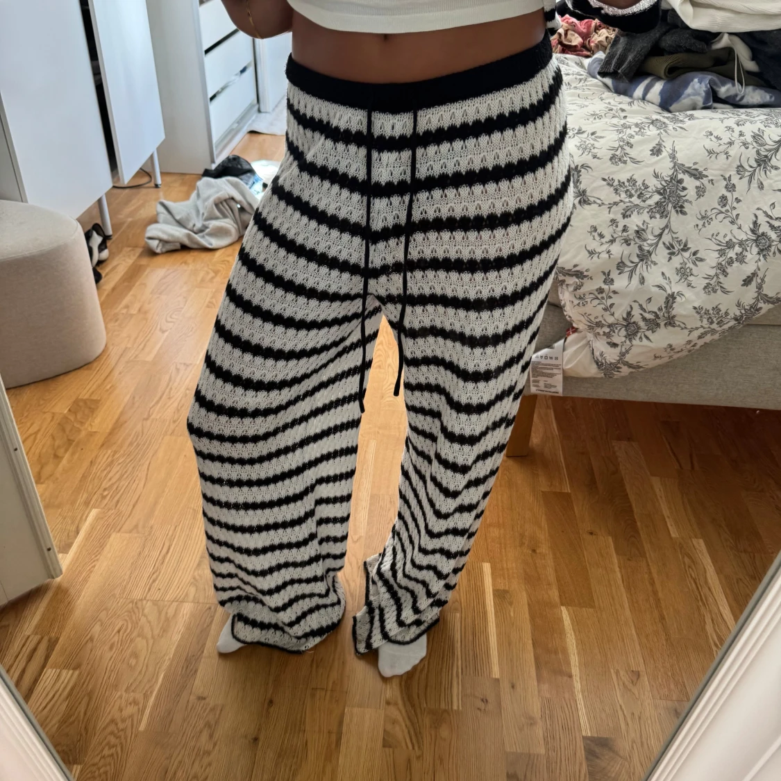 Säljer ett par stickade byxor med svartvita ränder och snörning i midjan. Byxorna har en loose och wide passform, perfekt för en chill och avslappnad look. Materialet är mjukt och stretchigt, vilket gör dem superbekväma att ha på sig.