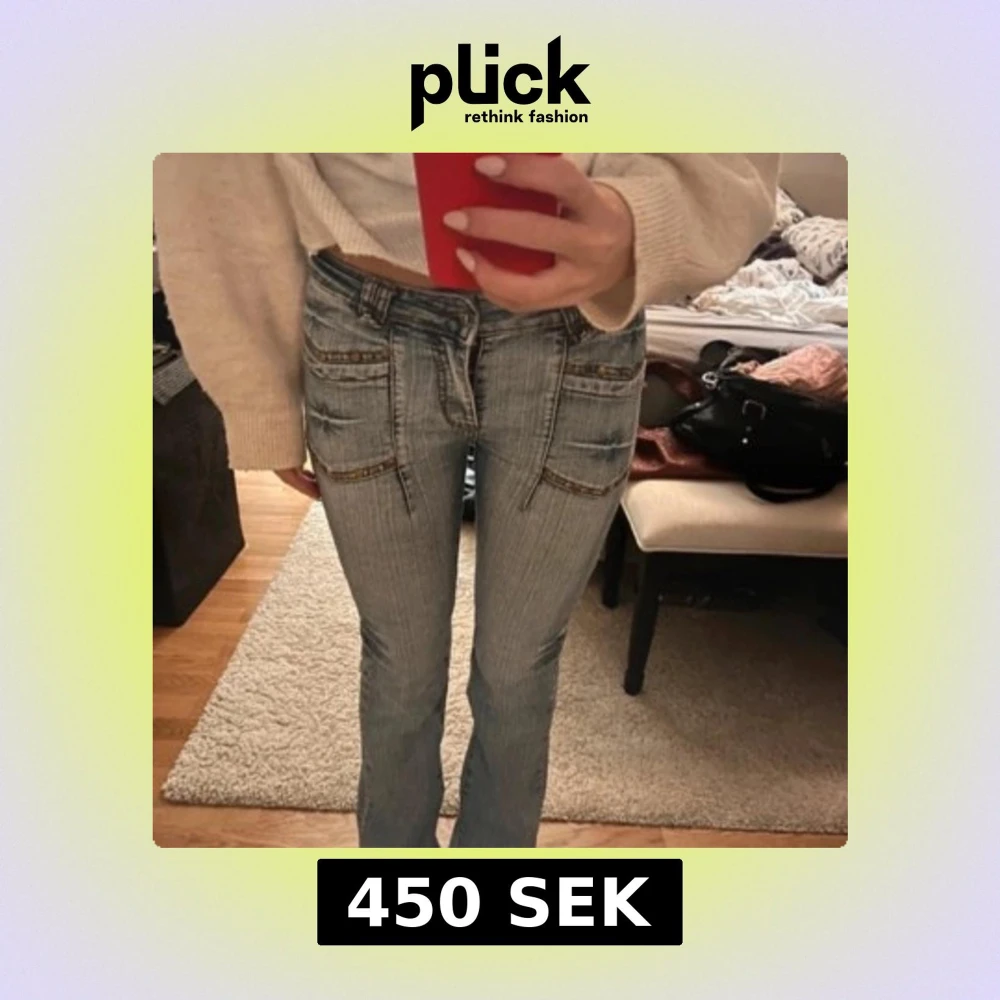 Säljer ett par ljusblå jeans med bootcut passform och dekorativa nitar på fickorna. Jeansen har låg midja och markerade sömmar framtill och baktill. Perfekta för dig som gillar en retroinspirerad stil.