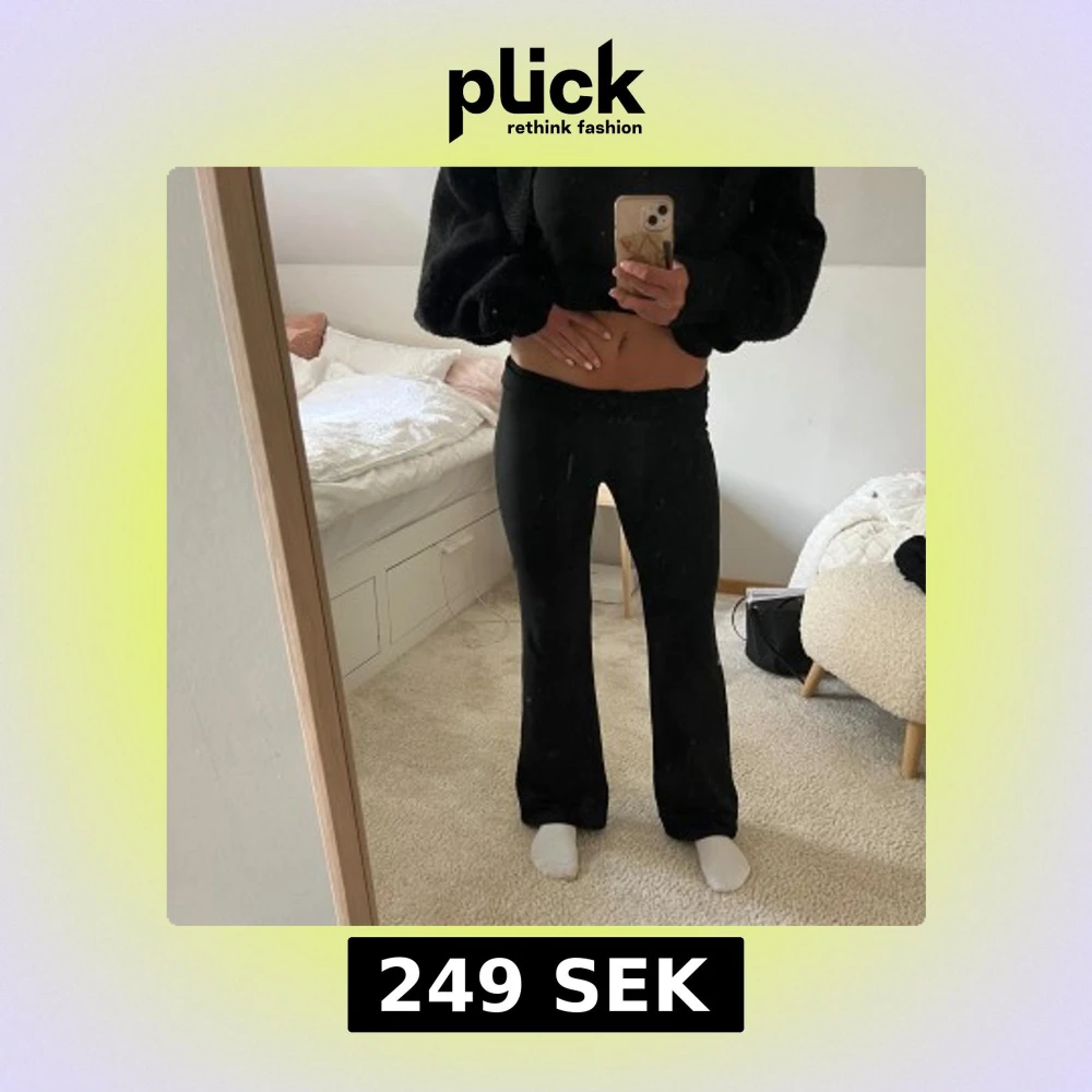Säljer ett par svarta leggings med bootcut-modell och hög midja. Byxorna är tighta upptill och utsvängda nertill, perfekta för en trendig och bekväm look. Passar till många olika stilar och är gjorda i stretchigt material.