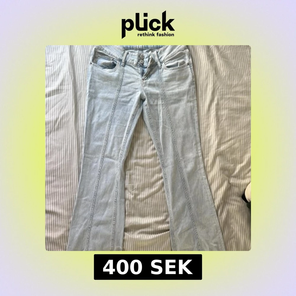 Snygga bootcut jeans i ljusblå tvätt med markerade pressveck längs benen. Klassisk femficksmodell och dubbla knappar i midjan. Perfekta för dig som gillar retrovibbar och vill ha ett par jeans som sticker ut lite extra.