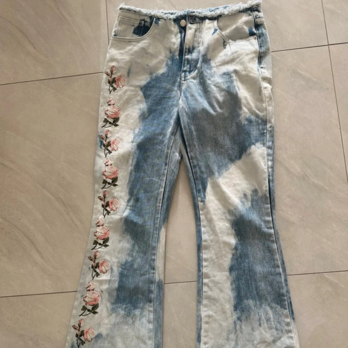 Unika jeans från PLT med broderade rosor längs ena benet.