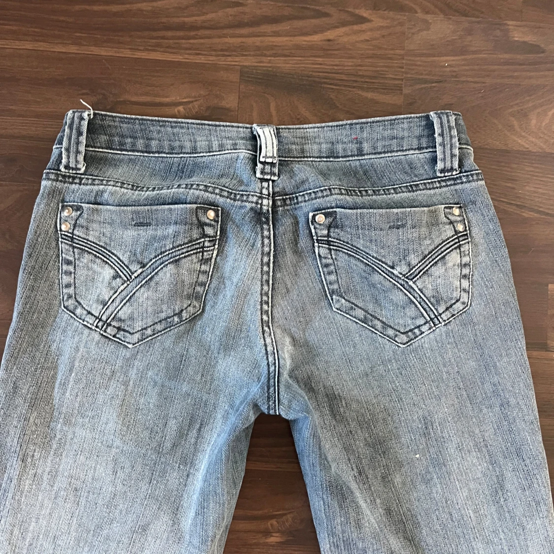 Säljer ett par ljusgrå jeans med bootcut passform och väldigt låg midja och klassiska femficksdetaljer. Jeansen har snygga slitningar och kontrastsömmar, samt bälteshällor och dragkedjegylf. Perfekta för dig som gillar en retro vibe och vill ha ett par jeans med lite extra attityd. Knaooen som man känner längts upp är borta men jag brukar sätta fast det med hårsnodd funkar toppen.