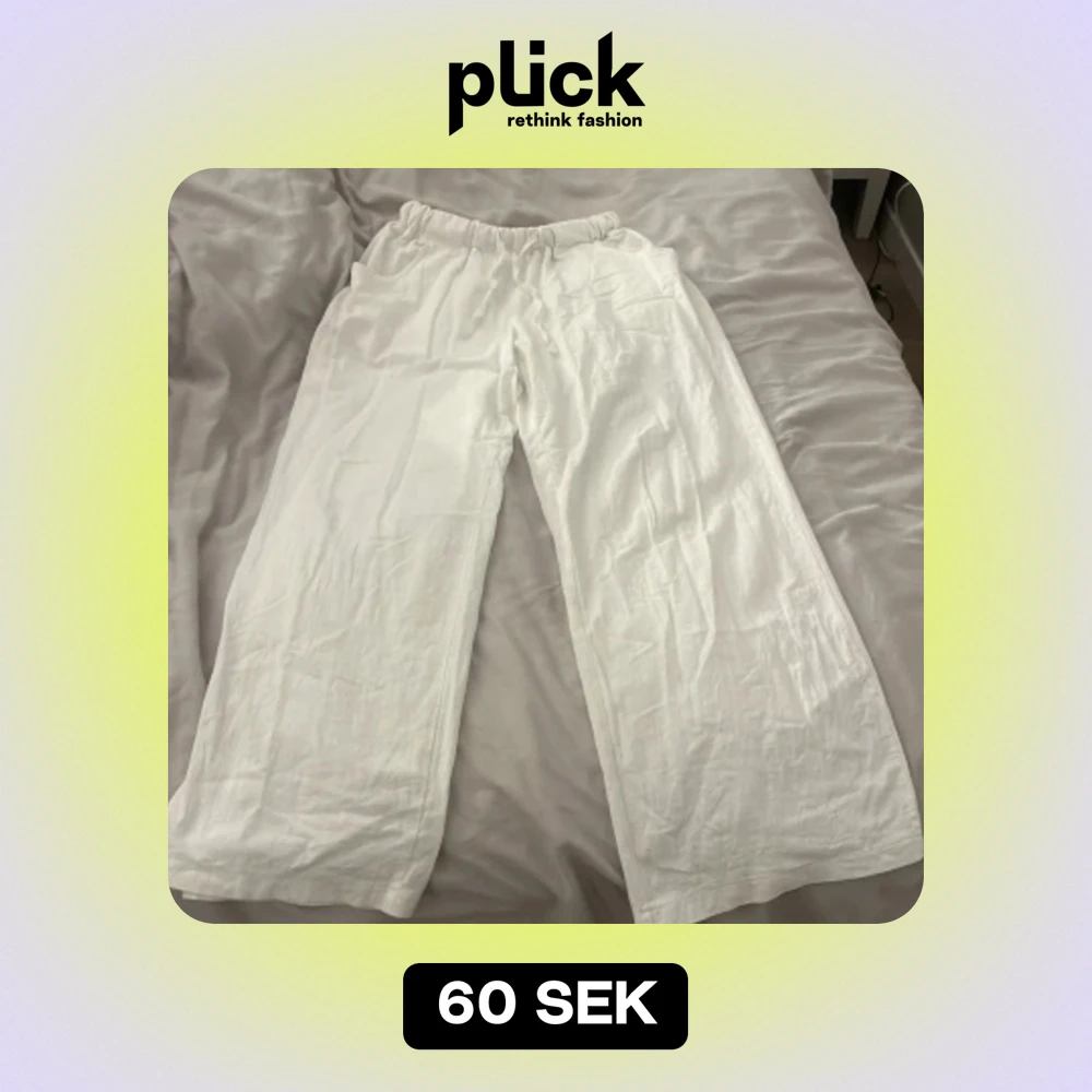 Ett par vita linnebyxor med snören i storleken S och sitter bra på mig som är 155. Byxorna är i bra sick och har inga fläckar eller hål m.m
