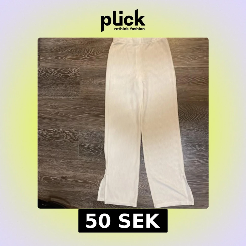 Säljer ett par vita ribbade byxor från Divided by H&M. Byxorna har hög midja, raka ben och små slitsar nertill. De är gjorda i ett mjukt material som är riktigt skönt att ha på sig och extremt skönt under hösten eftersom de håller dig varma, jag har knappt använt dessa heller bara några enstaka gånger