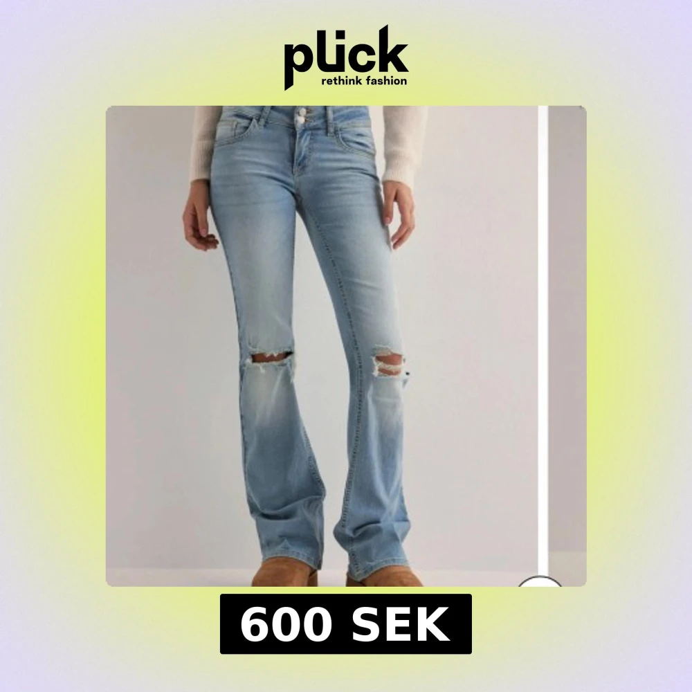 Snygga ljusblå bootcut jeans med slitningar på knäna. De har en låg midja💕 vill även säga att jag sprättat upp dessa så de passar perfekt på mig mig som är 1,74