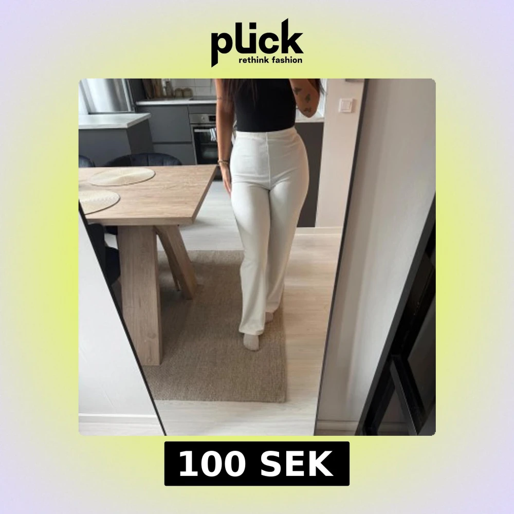 Säljer ett par snygga vita byxor från Nelly i storlek S. Byxorna är högmidjade med en vid passform och har en lätt texturerad yta. Perfekta att styla med en tight topp eller oversized hoodie. Superfräscha och stilrena!