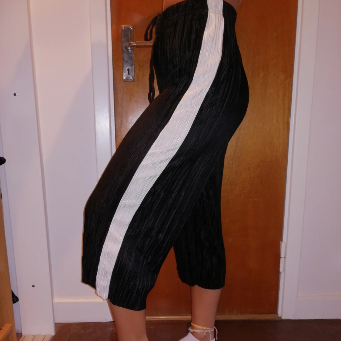 Sköna flowiga byxor, de är i plisserat tyg. Märket de kommer ifrån heter Light before dark. De är använda en gång ❤️