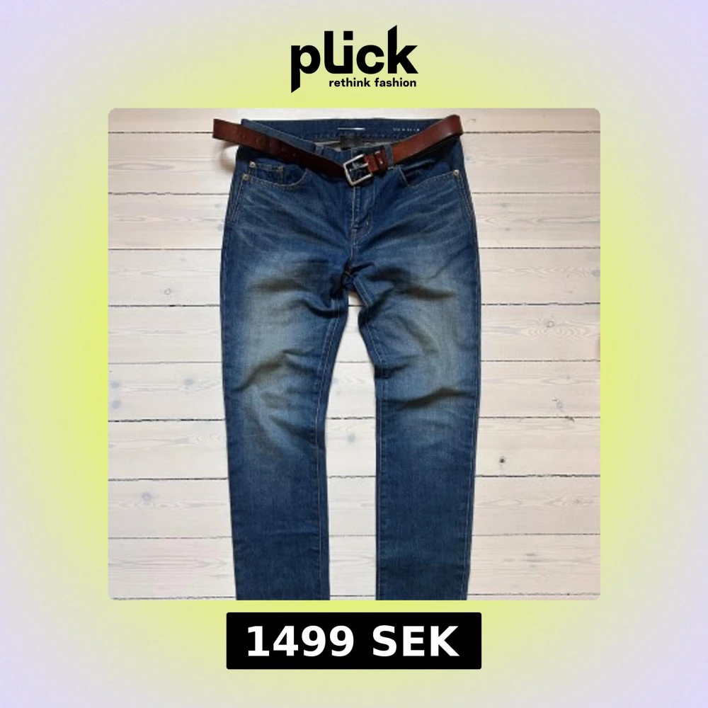 Snygga blå jeans från Saint Laurent med klassisk femficksdesign och bruna sömmar. Modellen är skinny och har en låg midja. Jeansen är tillverkade i Japan. D02 Modellen. 2017 året efter Hedi lämnade. I in princip nytt skick använda 1 gäng. Stackar skit snyggt.
