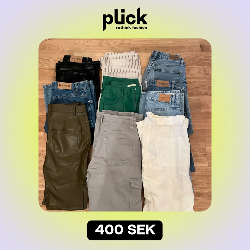 Säljer en samling av byxor i olika stilar och färger. Inkluderar jeans och byxor. Färgerna varierar från klassiskt blått och svart till trendigt grönt och vitt. Perfekt för både vardag och fest! 🛍️1 svarta byxor = storlek 34 Na kd 2 svart randiga = storlek 36 Na kd 3 lee jeans = storlek 34 4 jeans = storlek 34 Na kd 5 gröna byxor = storlek 34 STR 6 jeans = storlek 34 Na kd 7 jeans = storlek 34 Gina tricot 8 bruna byxor = storlek XS pull & bear 9 gråa byxor = storlek 34 Na