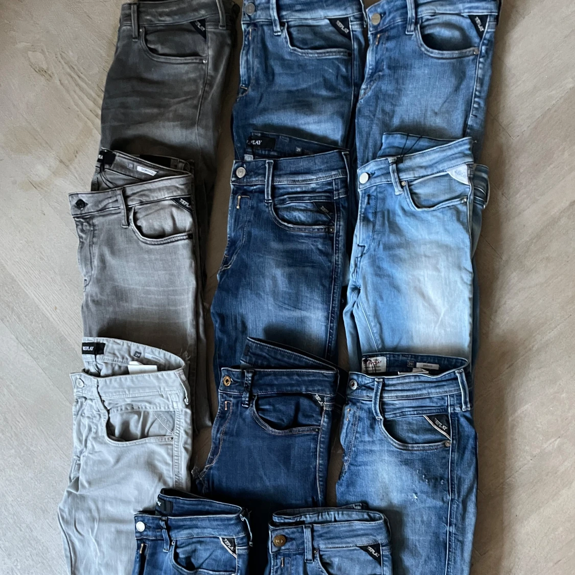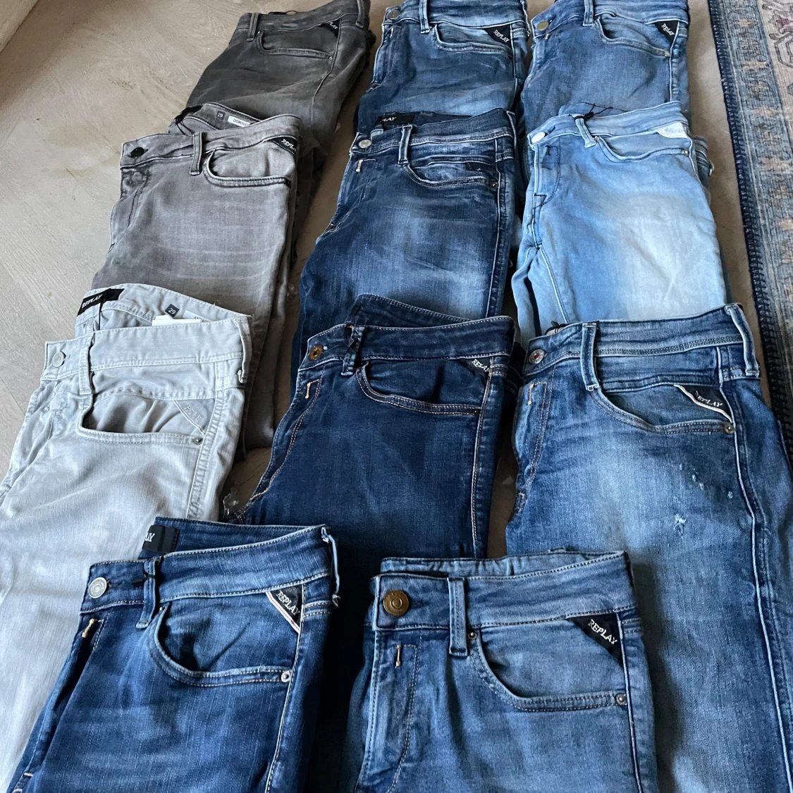 Säljer en samling av replay jeans i olika nyanser av blått och grått. Perfekt för alla tillfällen! Fråga om ett speciellt par eller storlekar kan ni göra i DM. 450kr per par jeans. 800kr för 2 par.