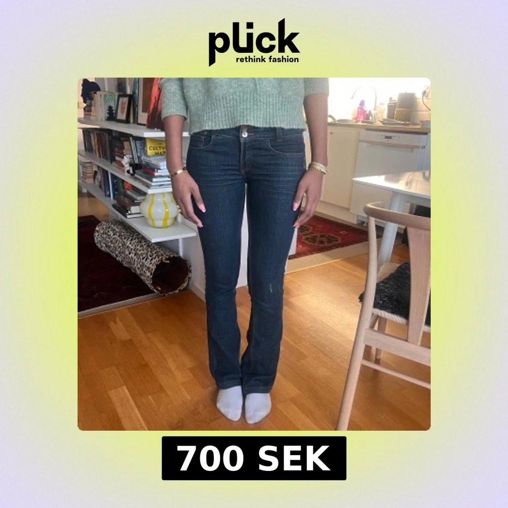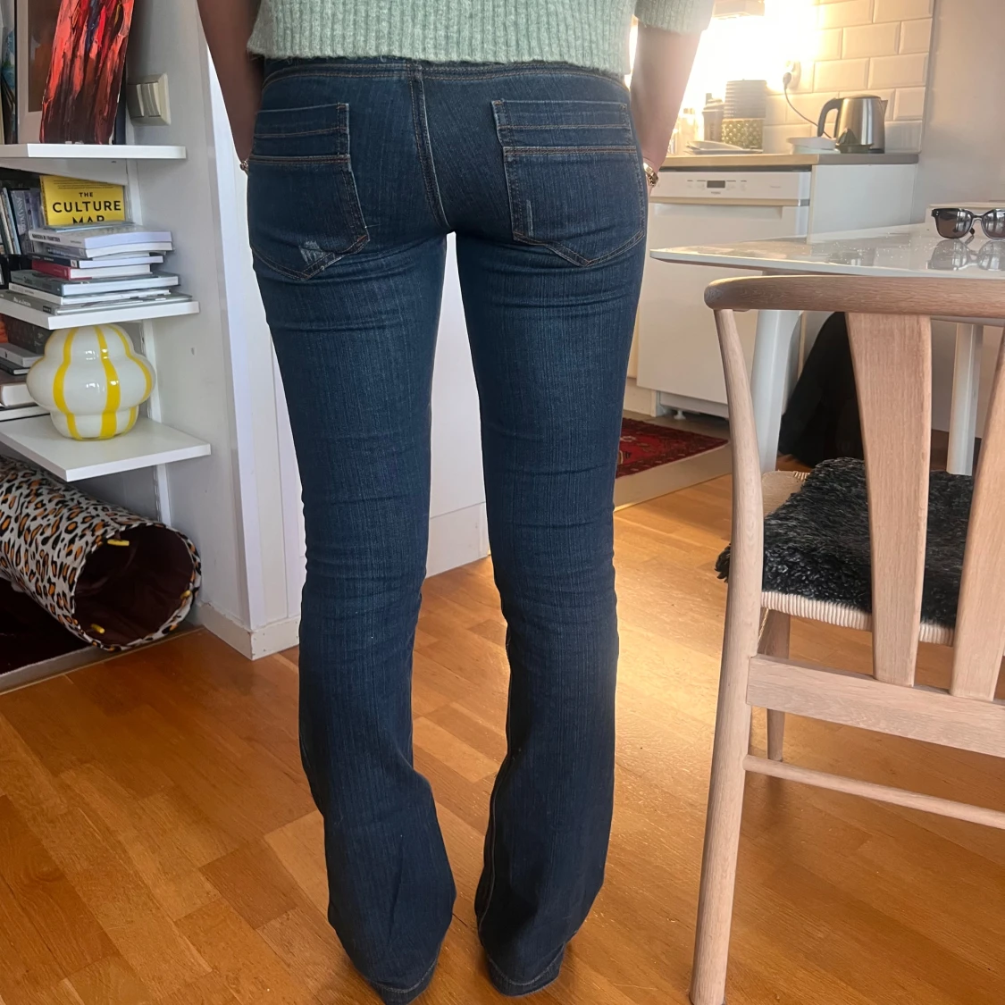 Snygga mörkblå jeans med bootcut och klassisk femficksdesign. De har en knapp och dragkedja framtill. Perfekta för en avslappnad stil.