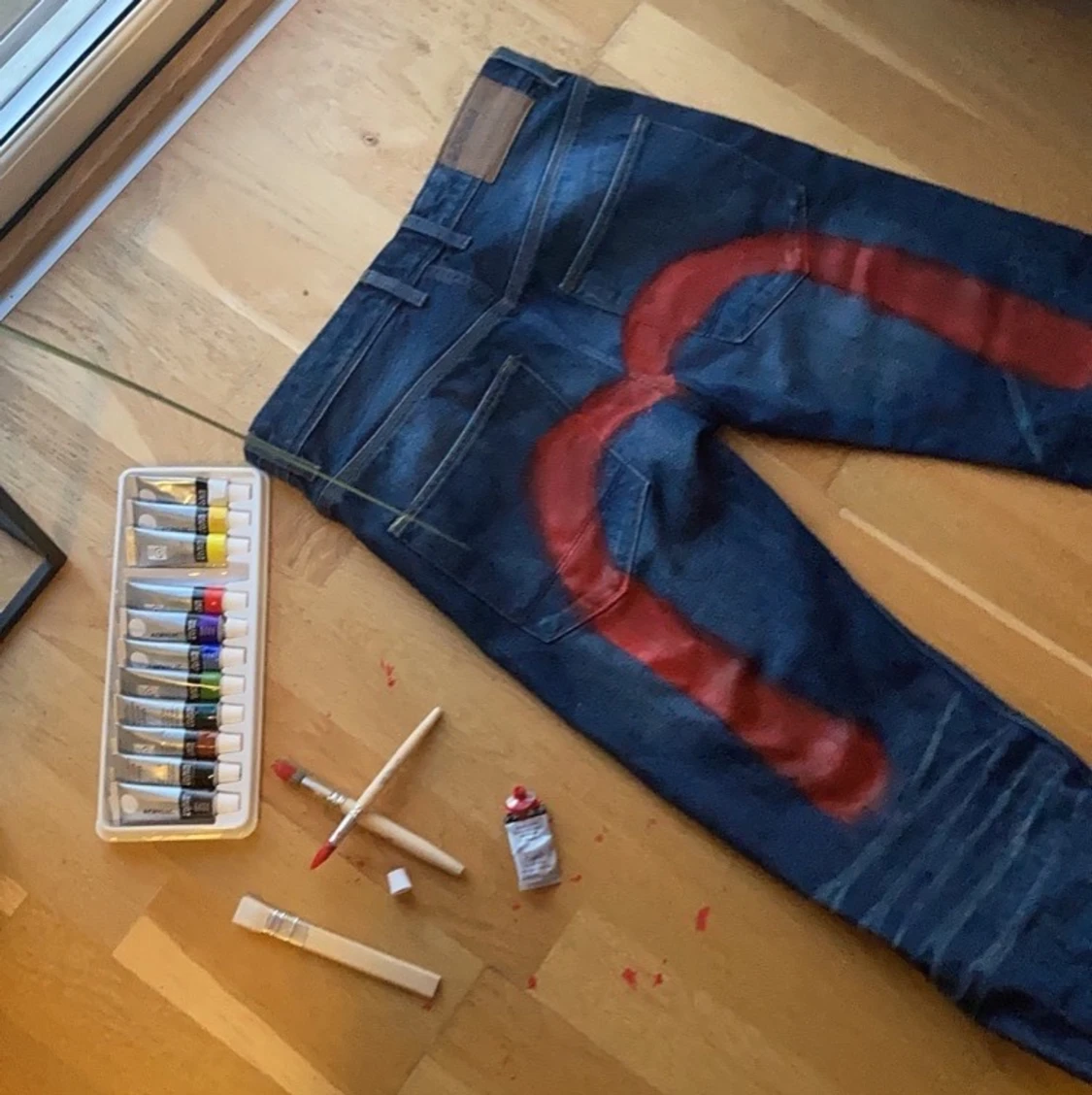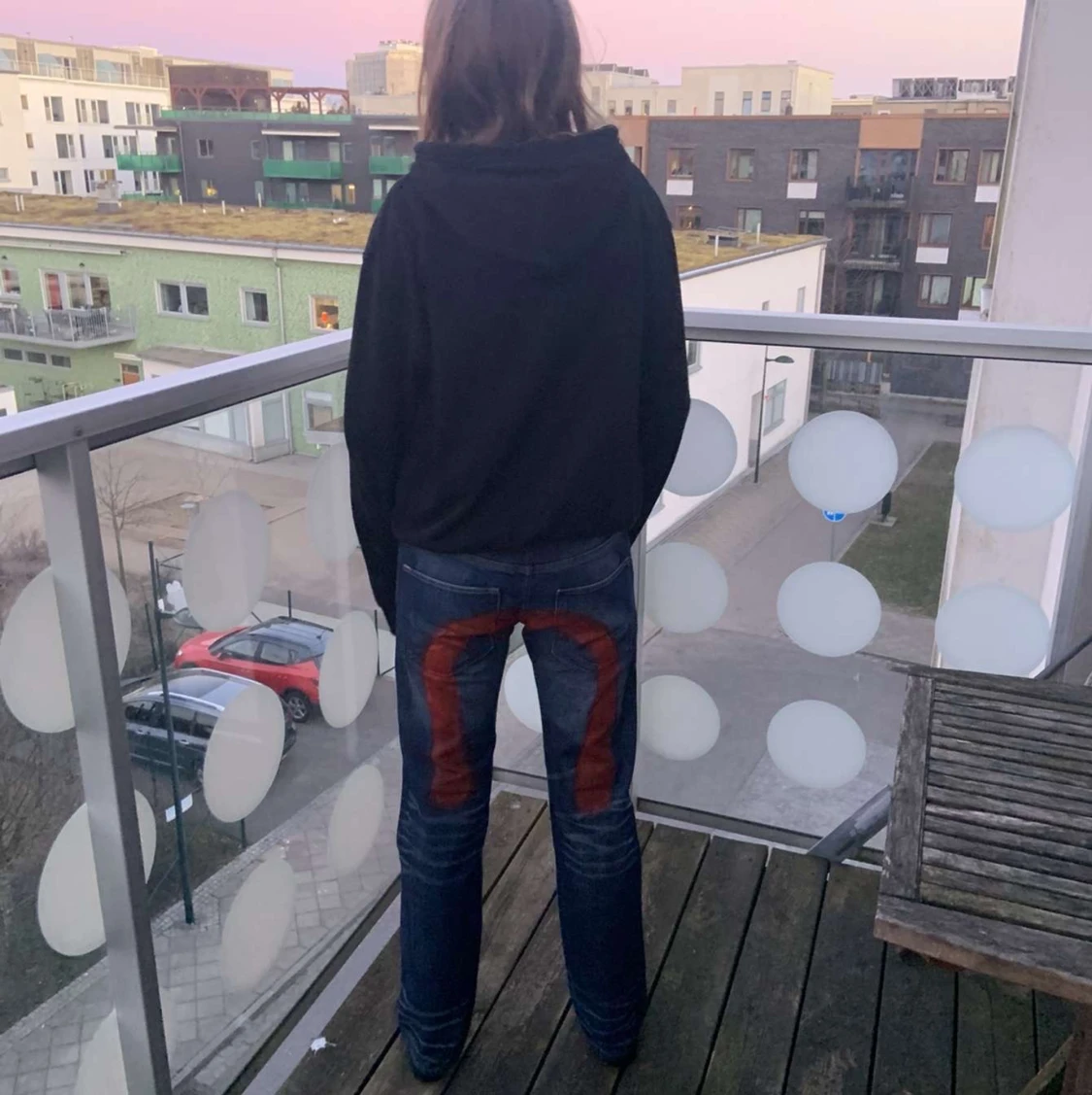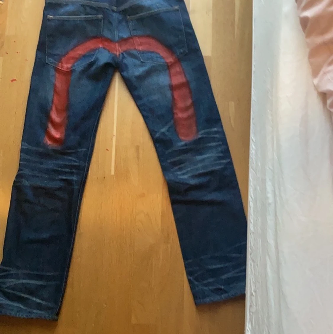 Säljer dessa asballa jeans! Har målat på den röda detaljen som gör en hel outfit 😻. Skriv vid intresse 😛. (Rekommenderas att tvätta de för hand, om man inte köper en sprej som skyddar färgen )‼️