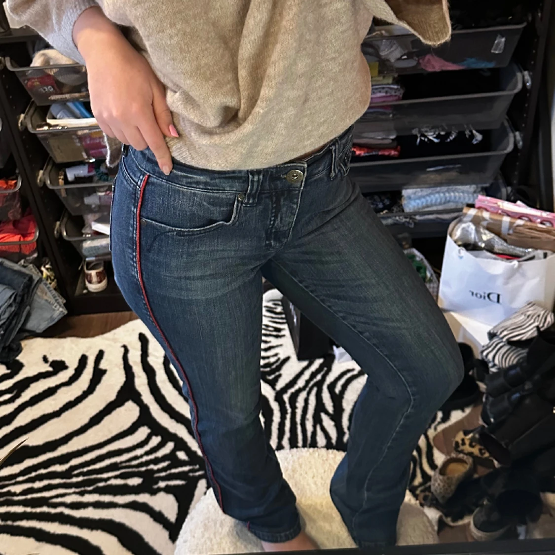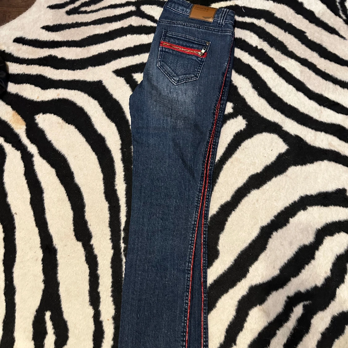 Så coola raka jeans från Arizona med röda detaljer på sidan samt bakfickan, kommer tyvärr inte till användning. Storlek 36, fint skick och inga defekter