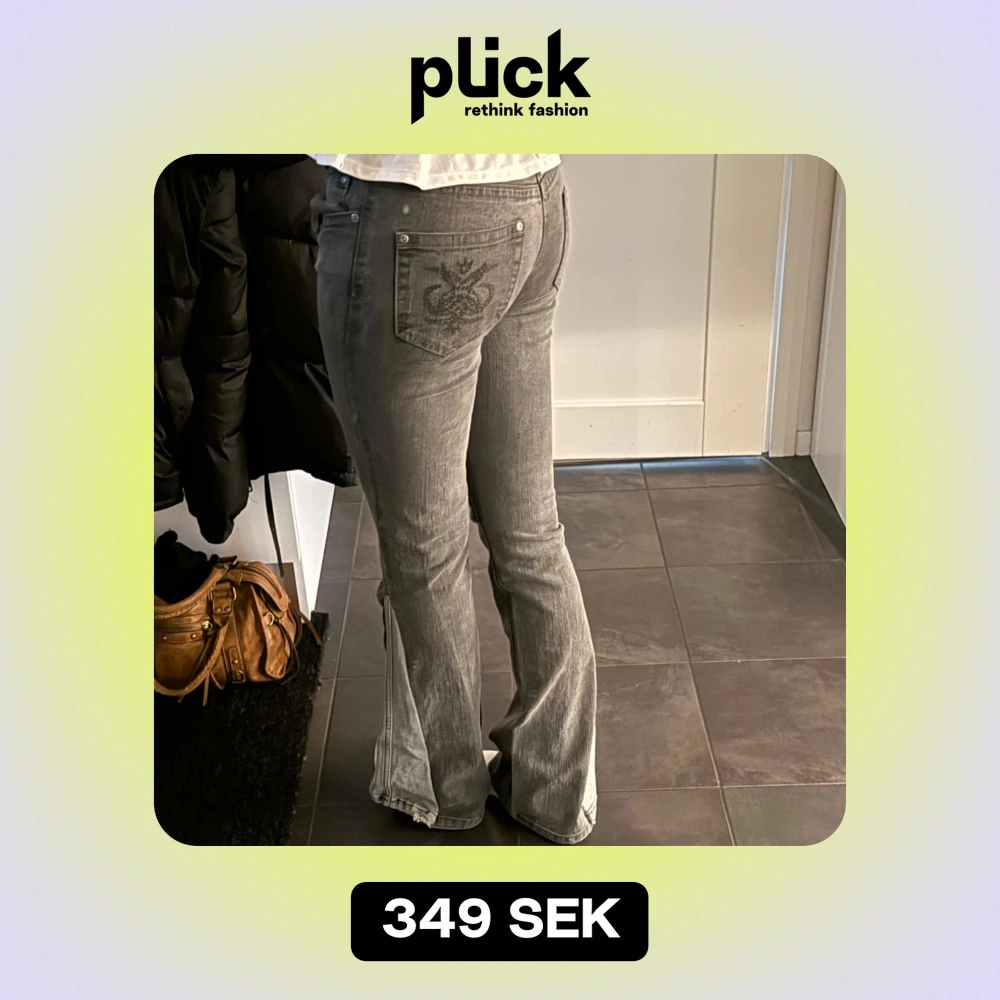 Säljer ett par snygga grå jeans i bra skick. De har en cool broderad detalj på bakfickan och en bootcut-stil som ger en retro vibe. Perfekta för höst och vår! Passformen är normal och de är lågmidjade.