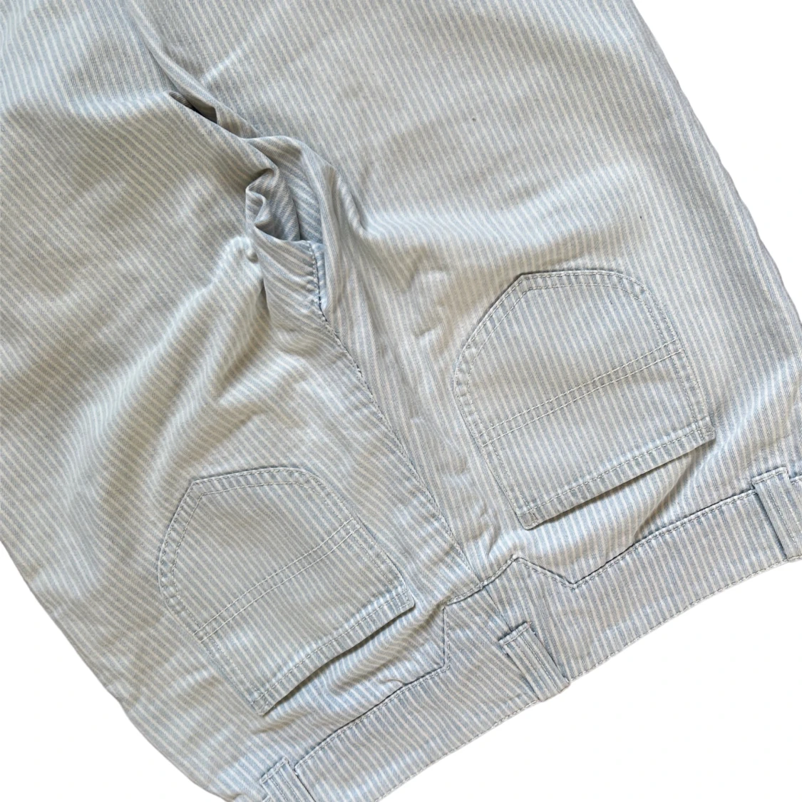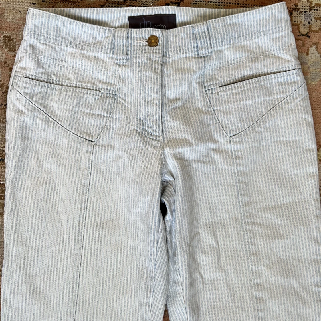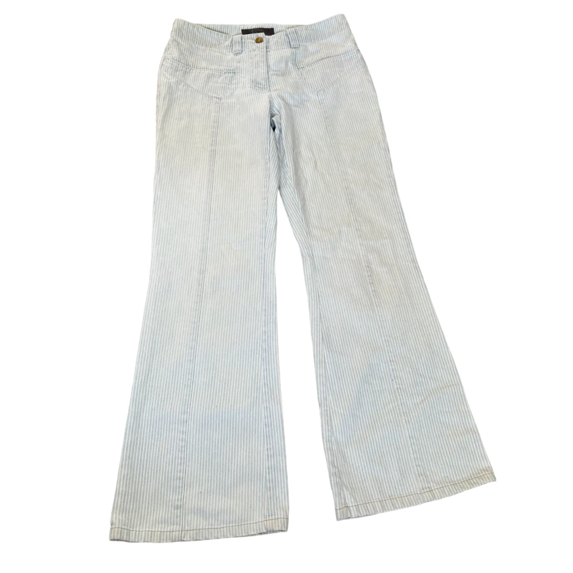 Utvidgade byxor i vitt med små ljusblå ränder på. Lågmidjade och i 100% bomull.
