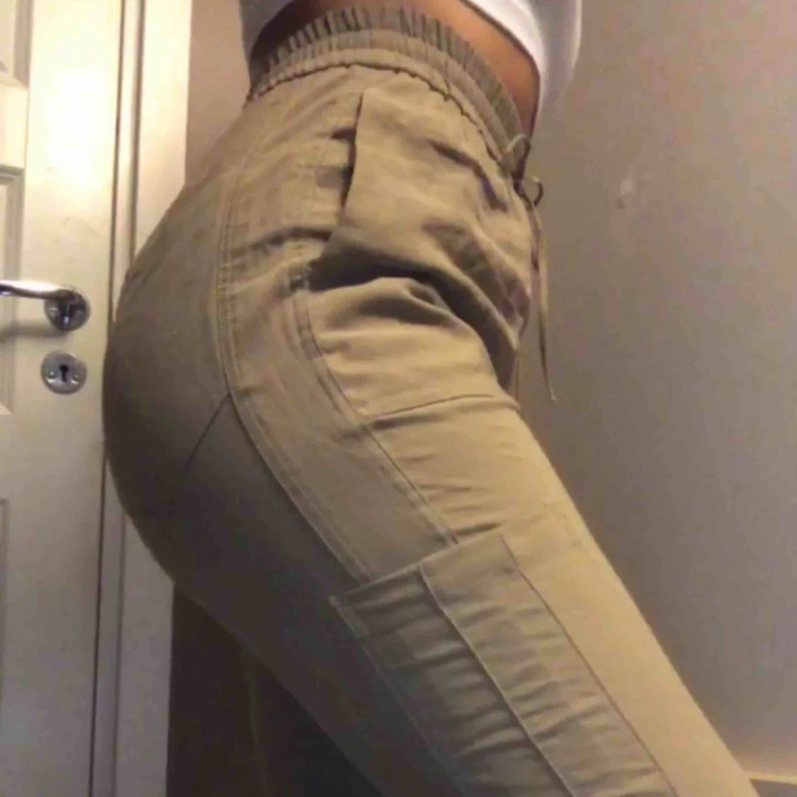 Högmidjade militärgröna chinos/byxor med fickor(korta i modellen). Är 160cm & de sitter lite över ankeln på mig. Snörning i midjan går inte att justera, är enbart detalj. Slittåligt material! Säljer på grund av de blivit för små. Frakt ingår i priset