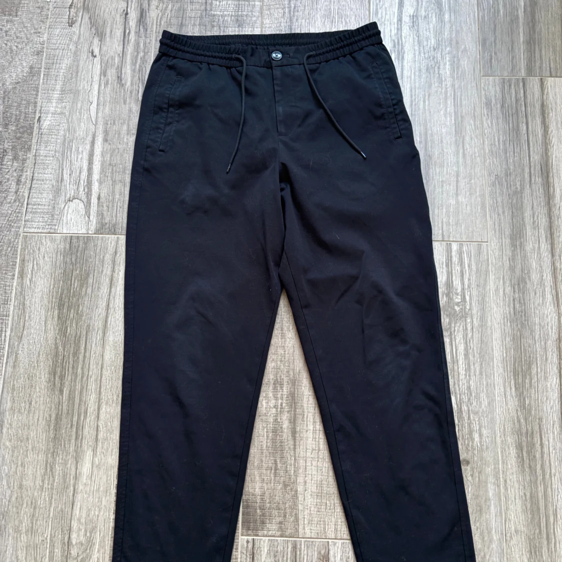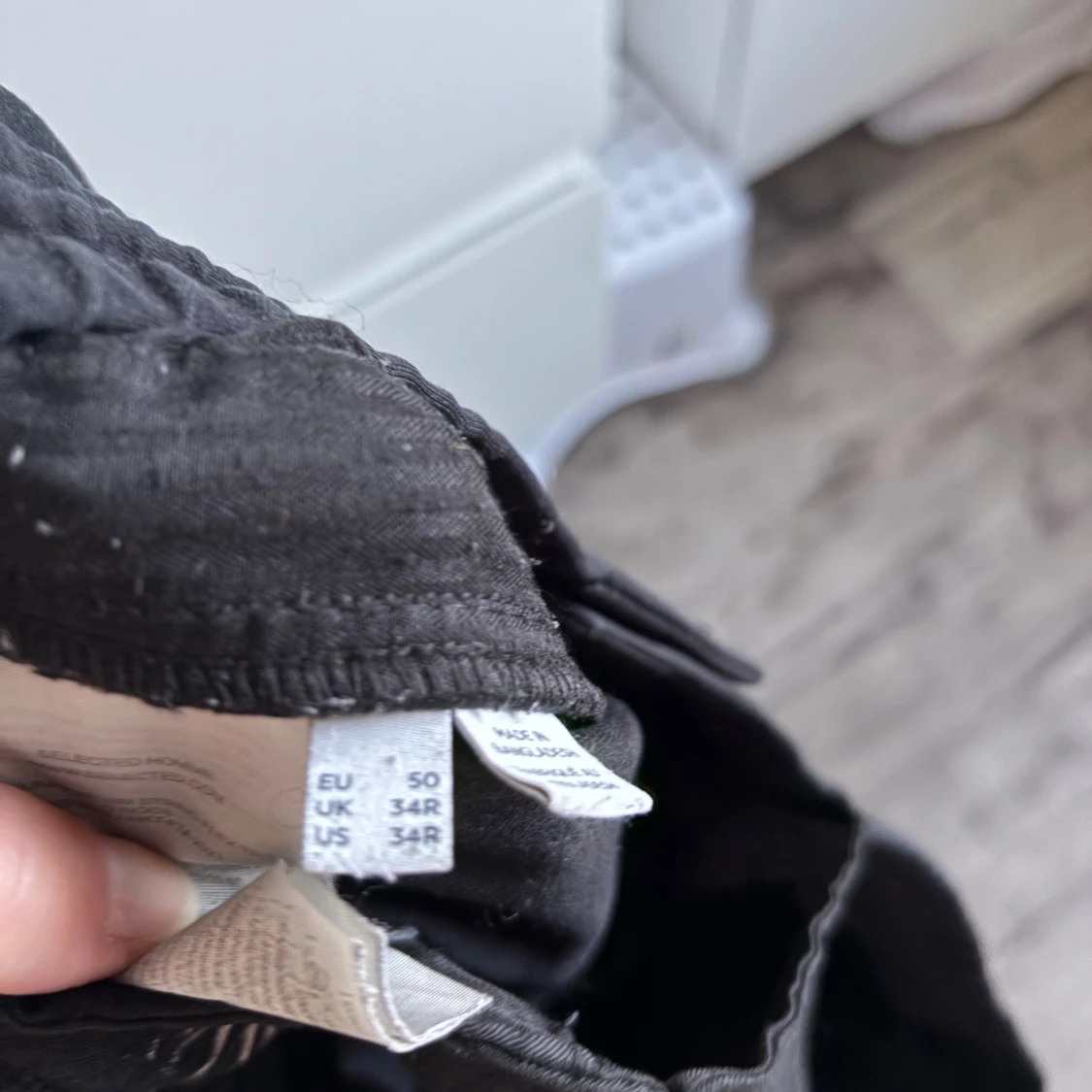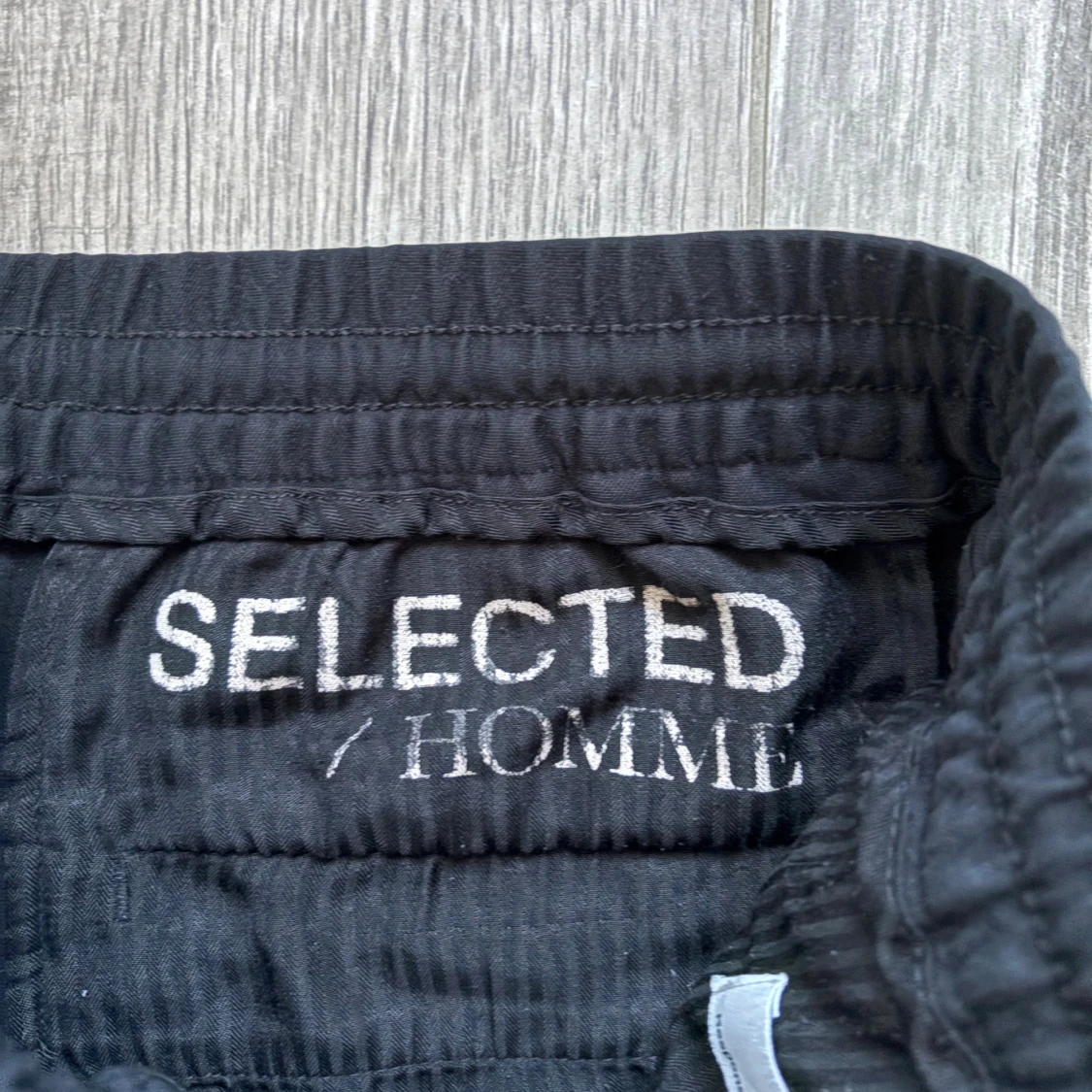 Svarta byxor från Selected Homme med elastisk midja, dragsko och knappstängning. Byxorna har raka ben och sidfickor, tillverkade i mjuk bomullsblandning för en clean och avslappnad look.