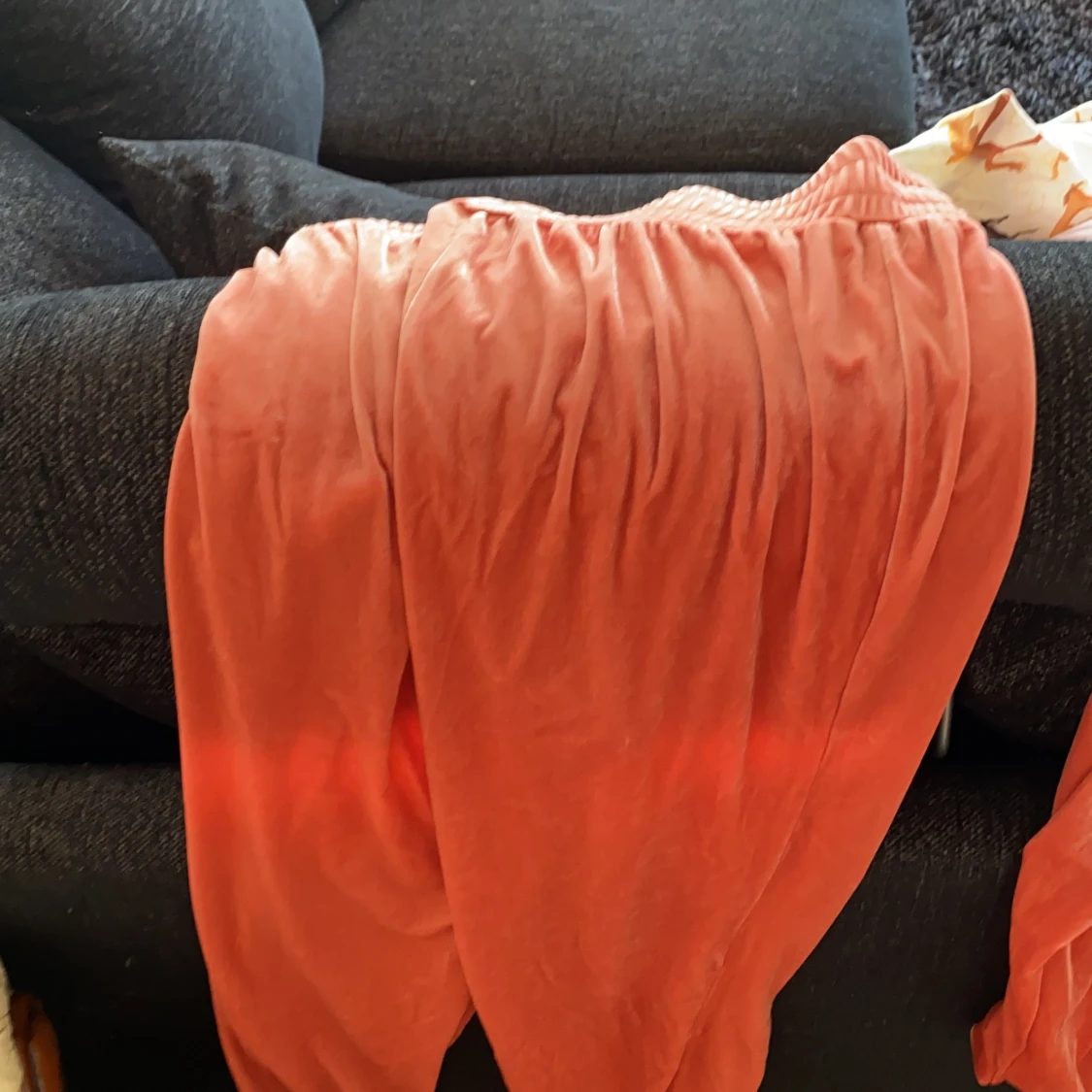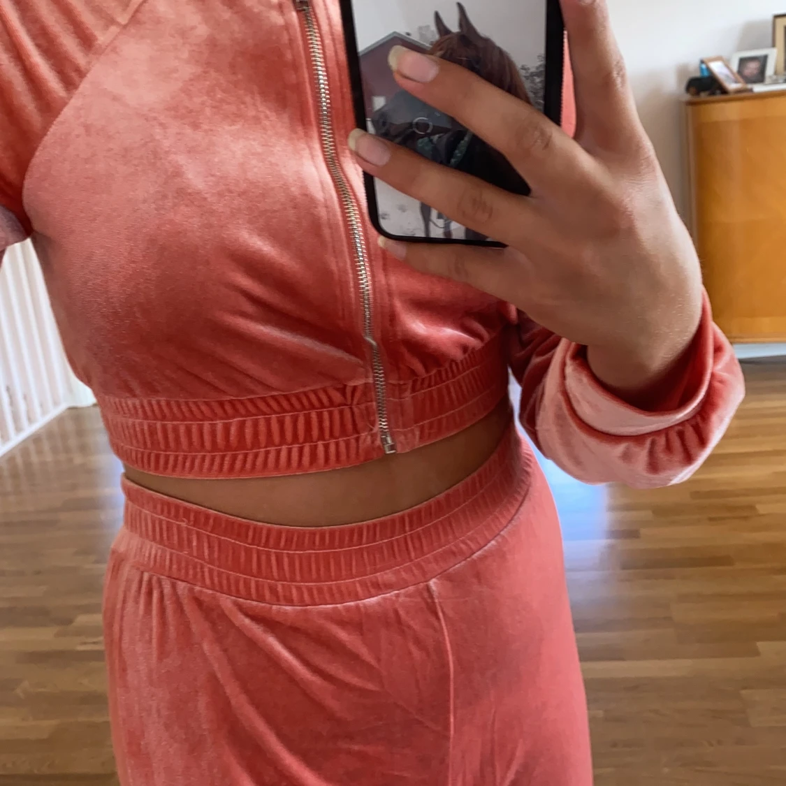 Väldigt skönt material, storlek S men passar M också, toppen passar alla men byxorna är lite korta för mig som är 174cm så passar nog dem som är 170 å kortare :) Pris 130kr ink frakt
