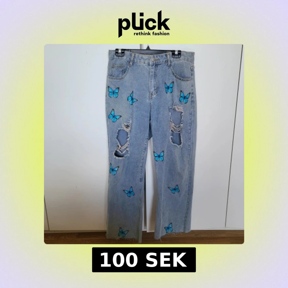 Snygga ljusa jeans med blå fjärilar och slitna detaljer. Byxorna har en rak passform och är dekorerade med fjärilar över hela benen. Perfekta för en unik och trendig stil.