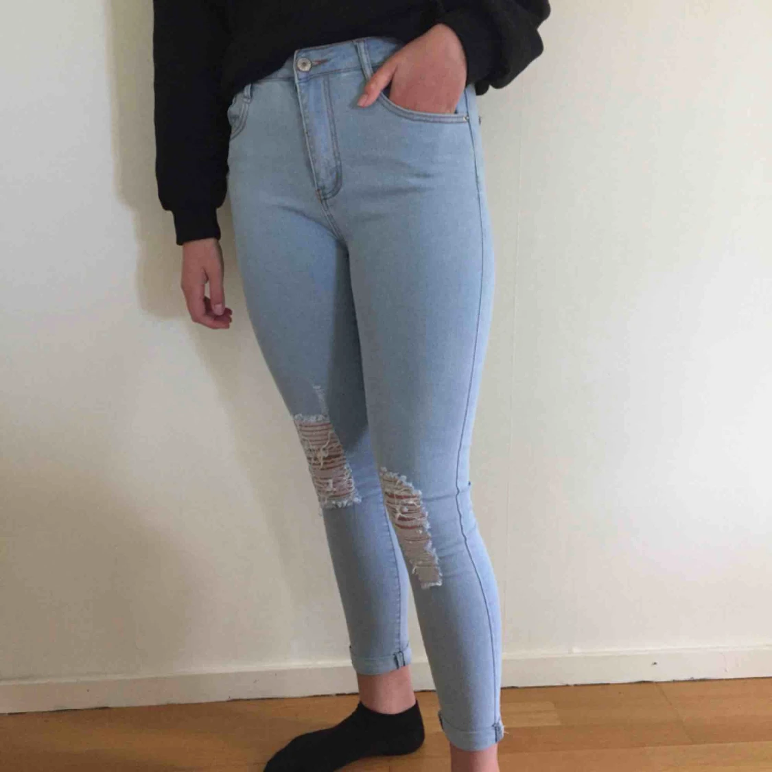 Ett par jeans från SHEIN. Har aldrig använder dem och är i bra skick. De sitter lite tajtare och har hål på knäna samt en uppvikt kant vid slutet på benen. PS: tar bara frakt och det kostar 70 kr🔥💗
