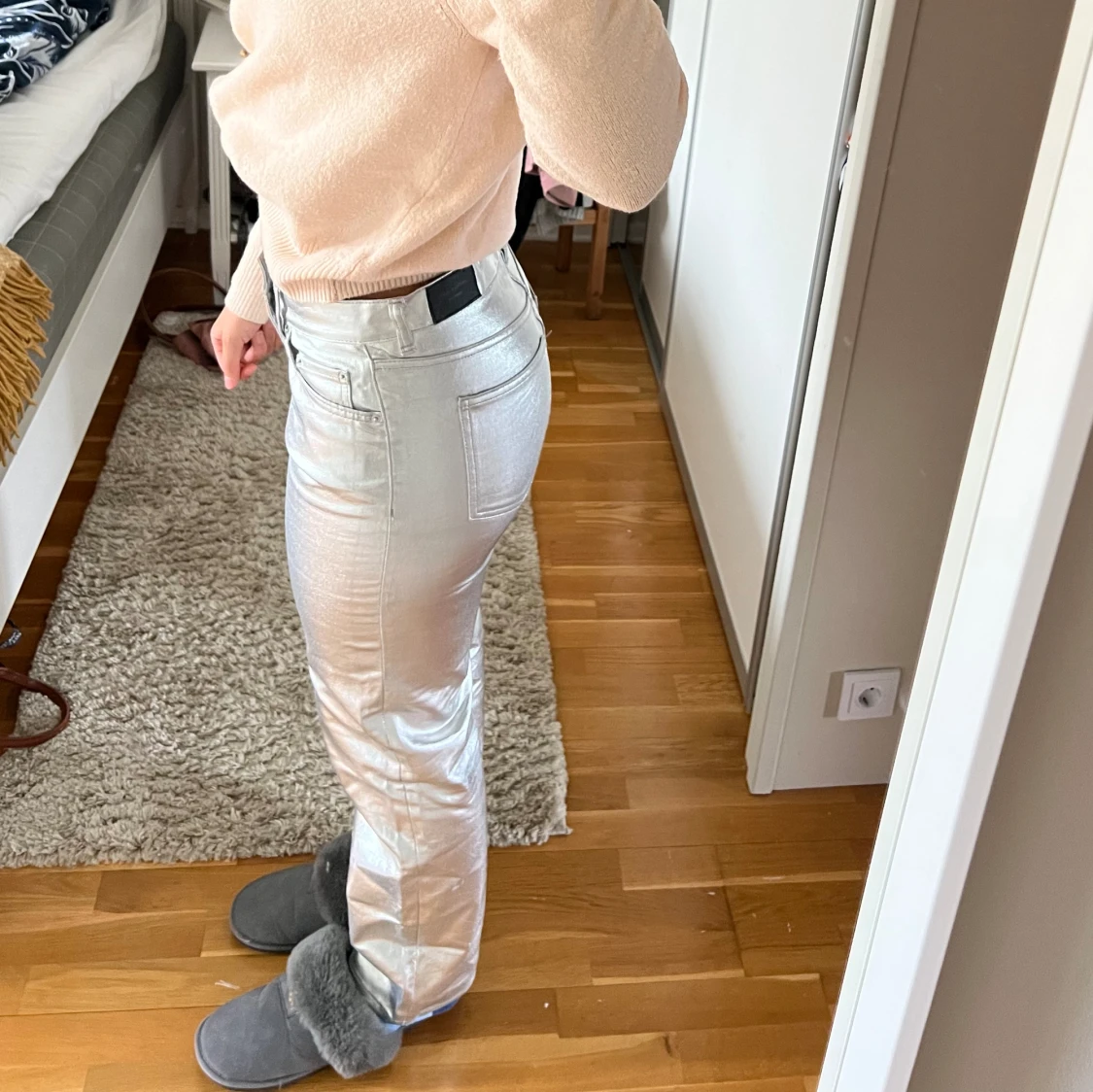 Säljer dessa silvriga byxor från Gina Tricot i nyskick-använt. Storlek 38. Storlekarna: Midjemått: 76 cm. Höftmått: 100 cm. Innerbenslängd: 78 cm. Nypris på hemsidan 599 kr. Använd gärna ”köp nu” funktionen