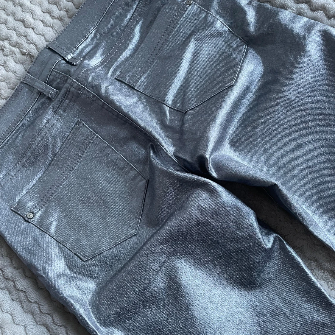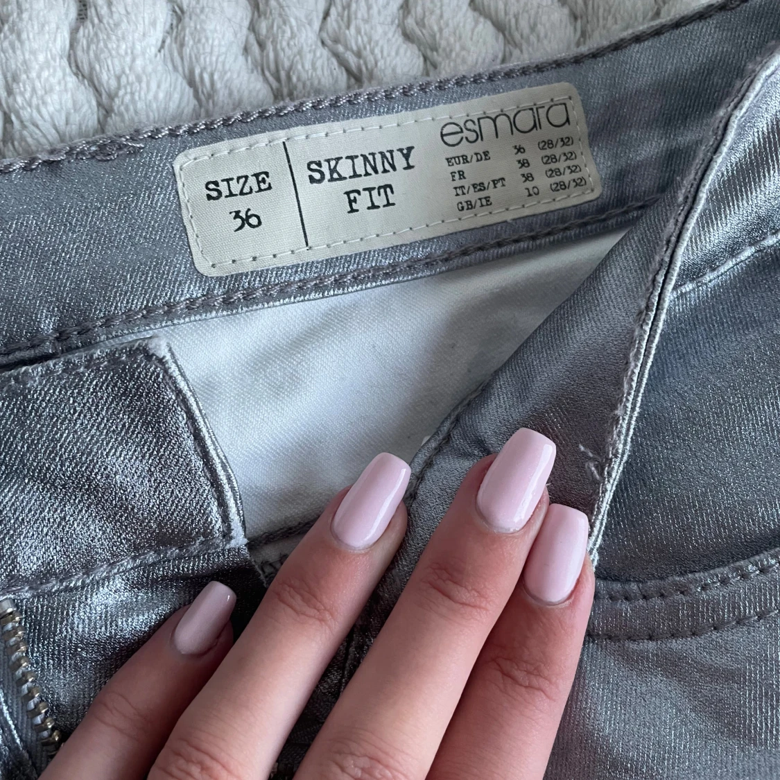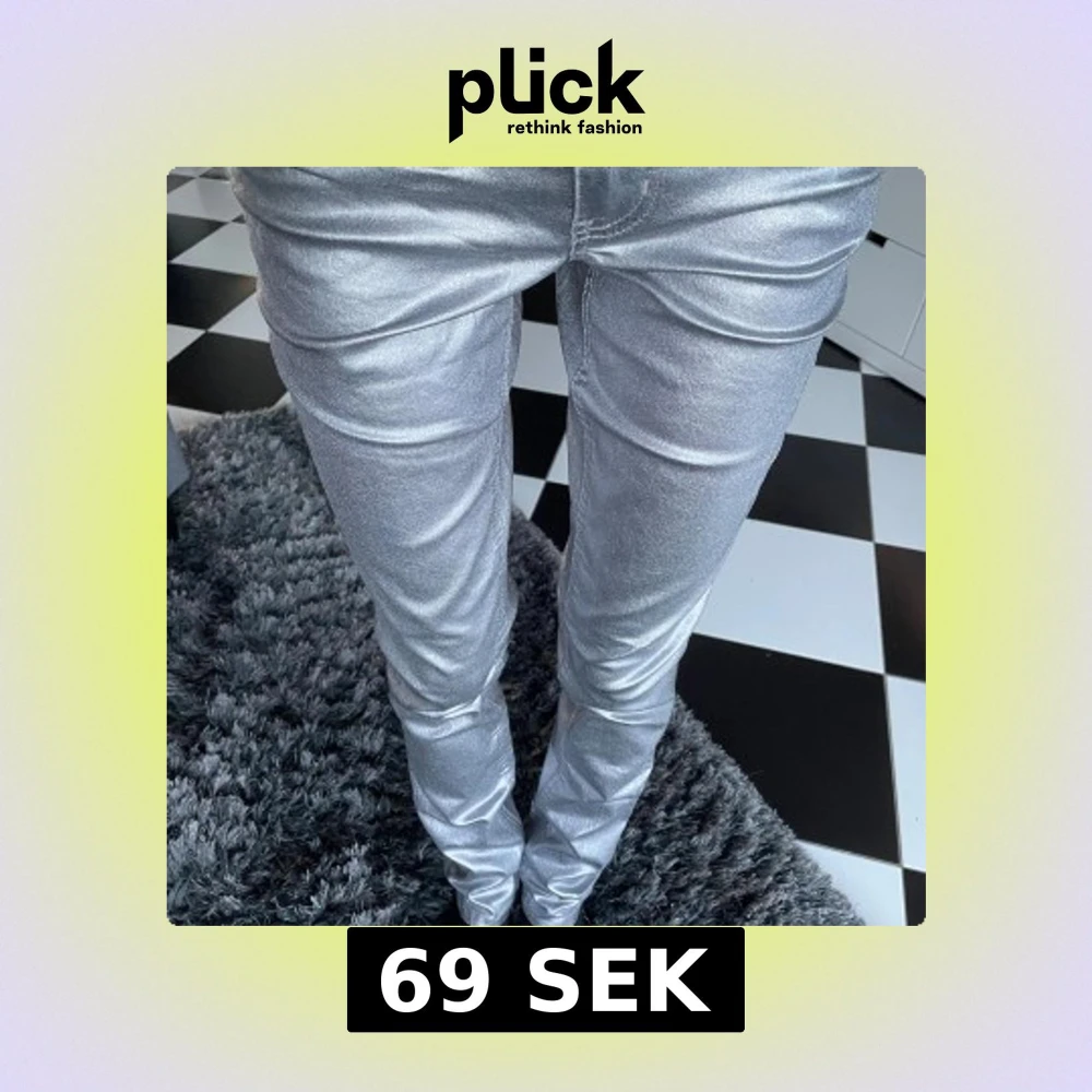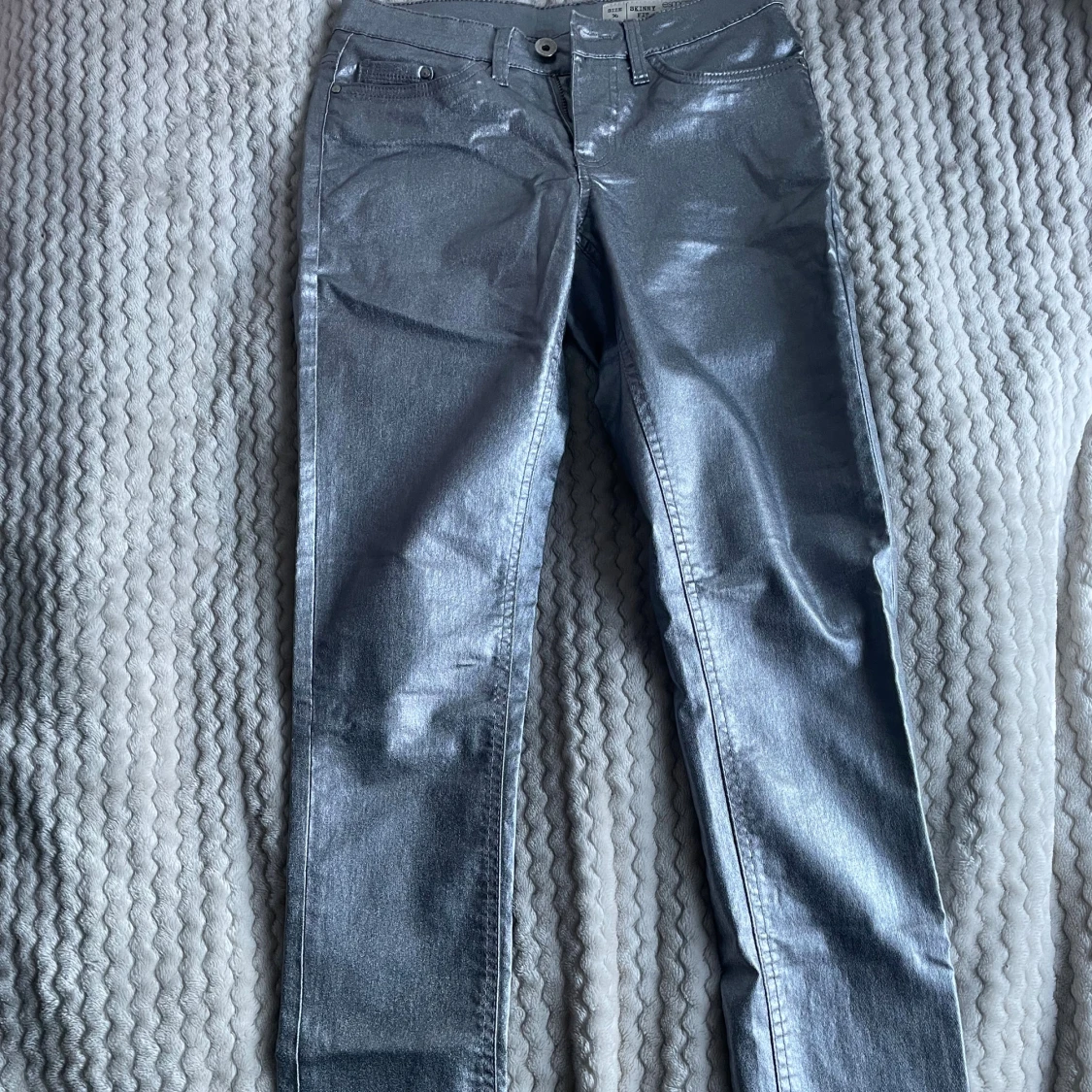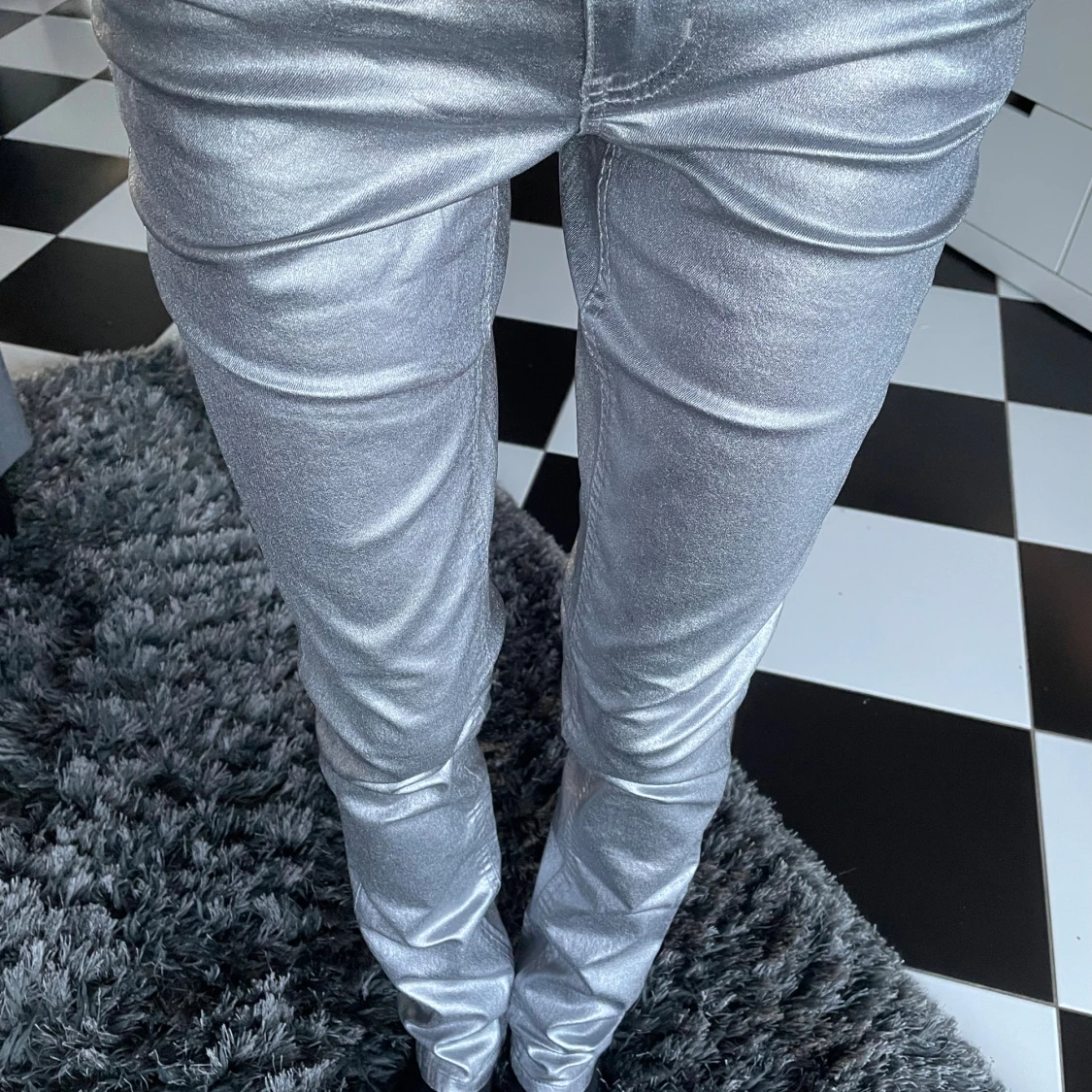 Säljer ett par glansiga silverfärgade jeans från Esmara i skinny fit. Byxorna har klassisk femficksdesign, normal midja och smal passform hela vägen ner. Aldrig använd eller tvättad. Helt perfekt för fester och halloween.