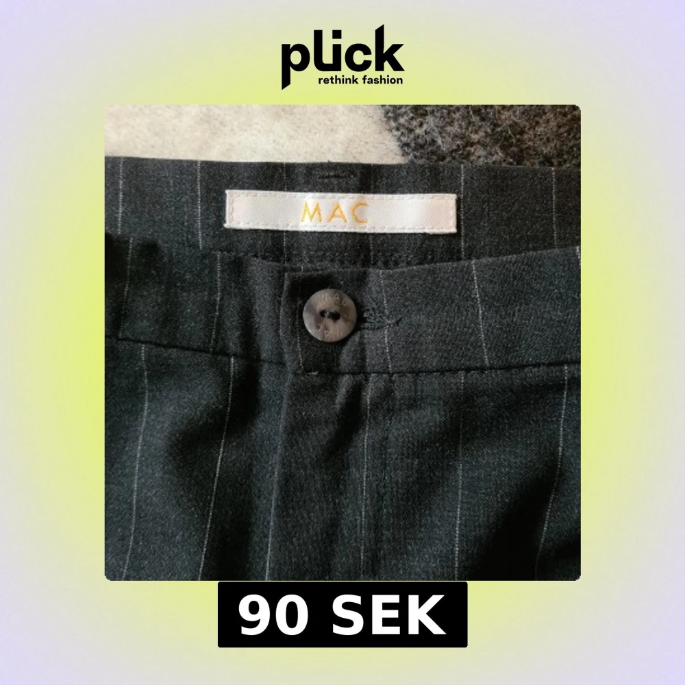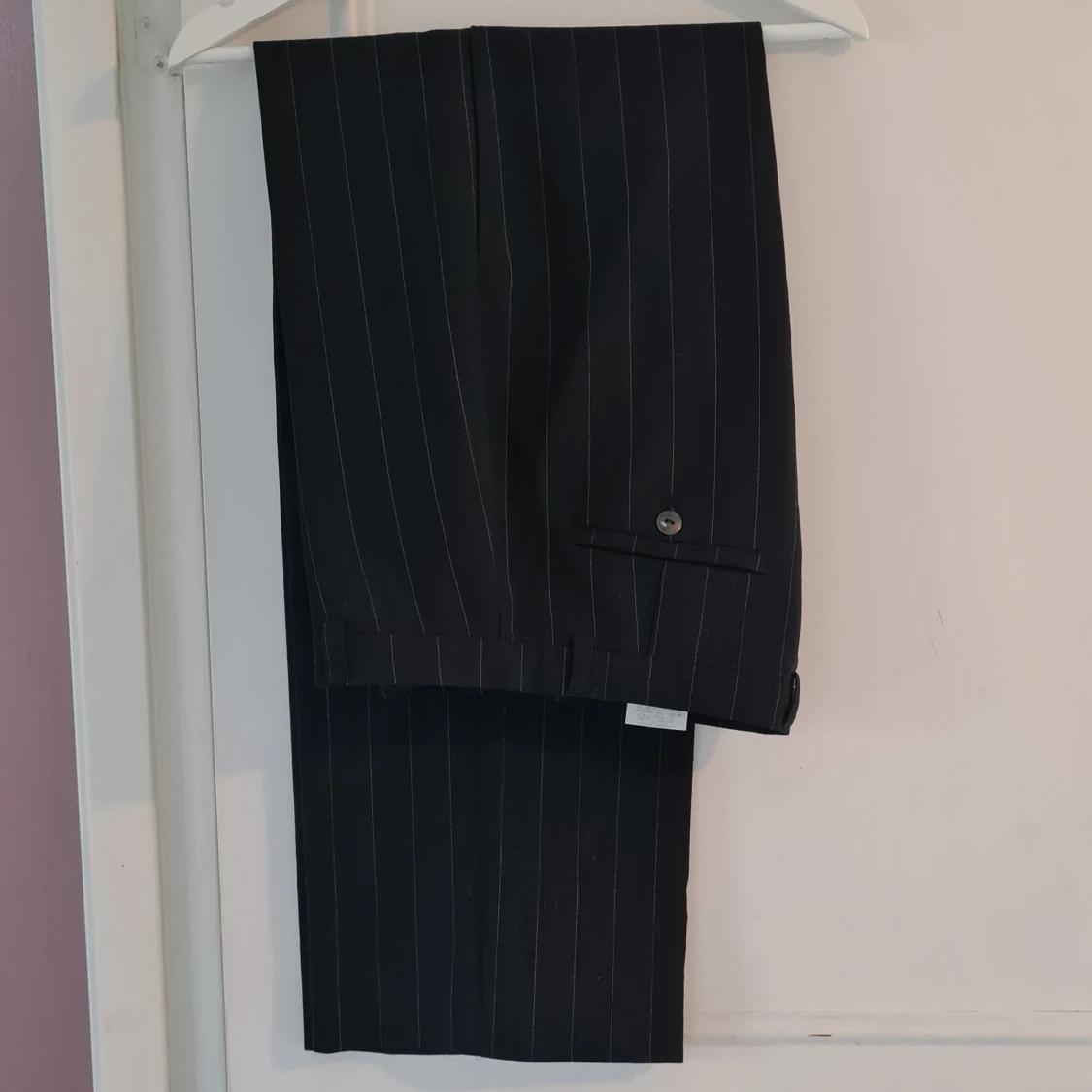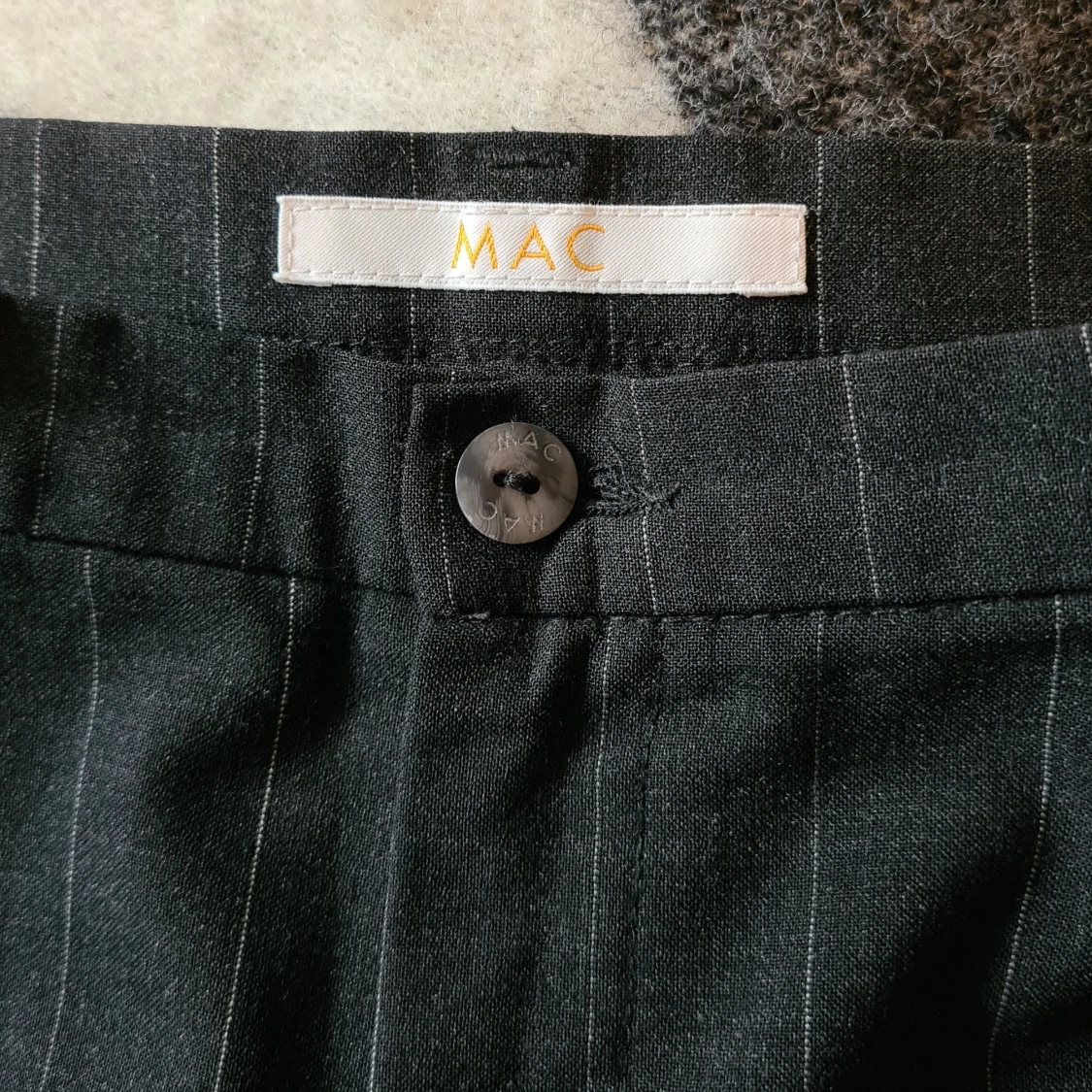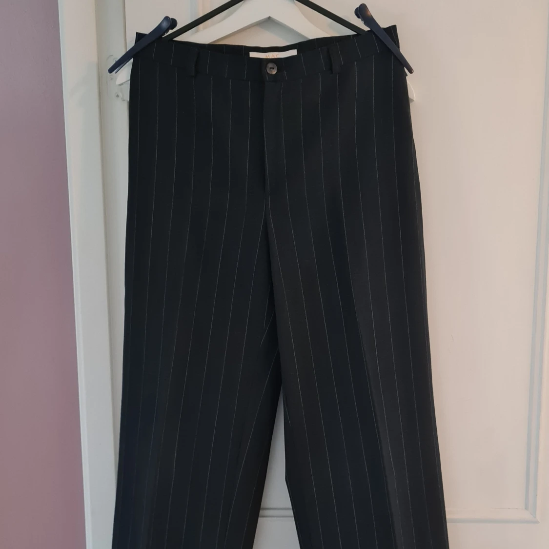 Snygga svarta kostymbyxor från MAC med tunna vita ränder. Klassisk passform med raka ben och knappstängning i midjan. Långa och stiliga med pressveck.
