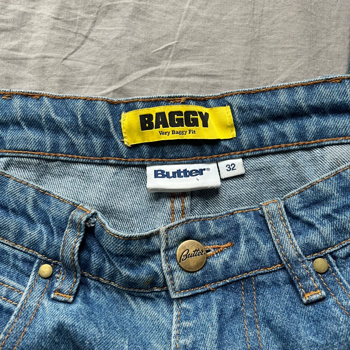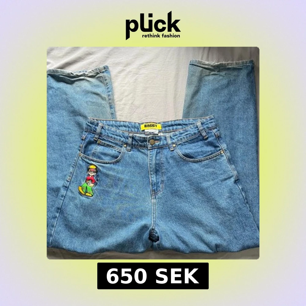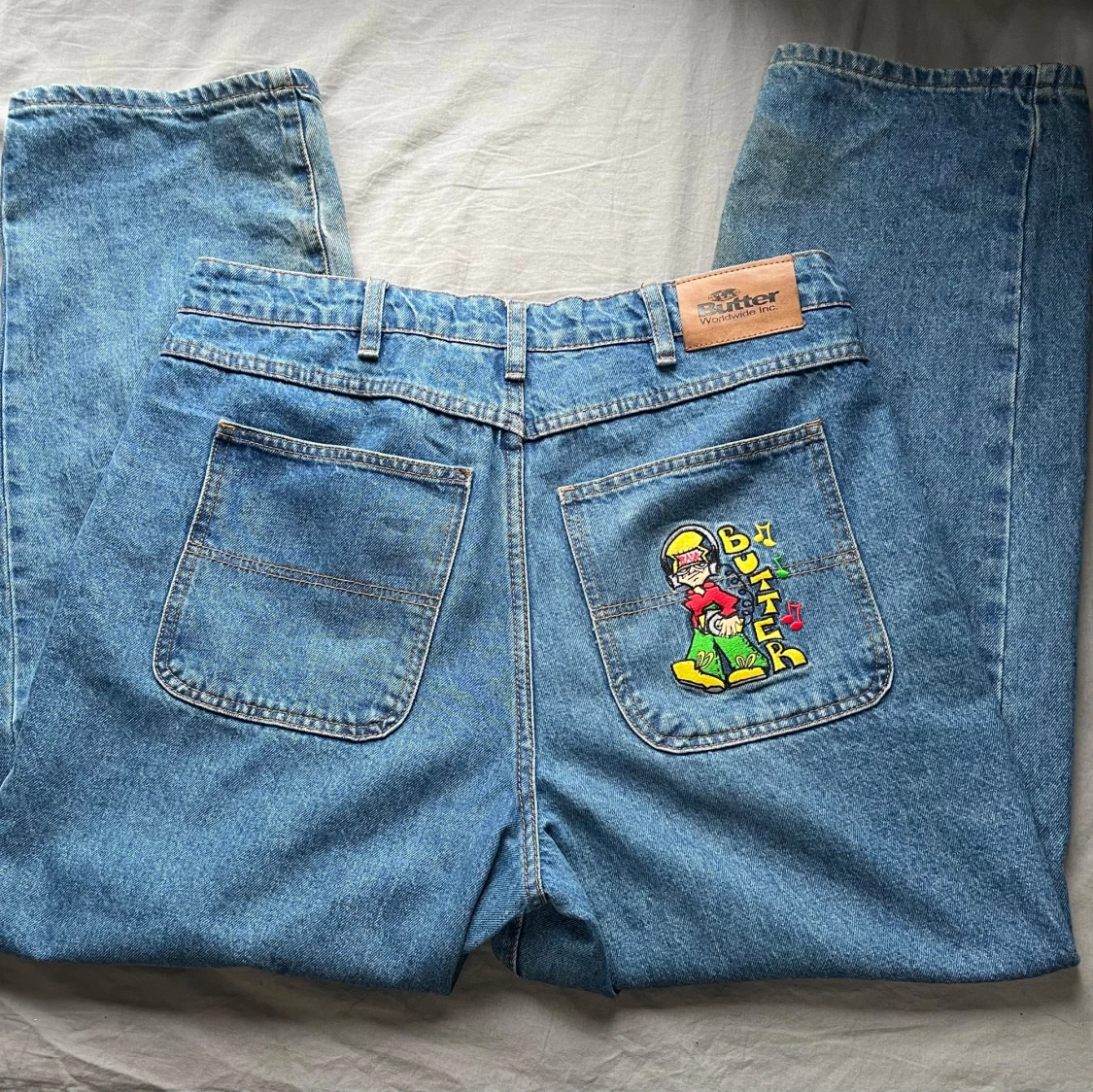 Säljer ett par Butter Goods Bass Baggy Jeans i storlek 32. Klassisk baggy passform i tvättad blå denim med broderad grafik fram (bild 3). Använda men i okej skick, lite slitage/blekning vid nederkanterna (se bild 5), annars hela och fina.