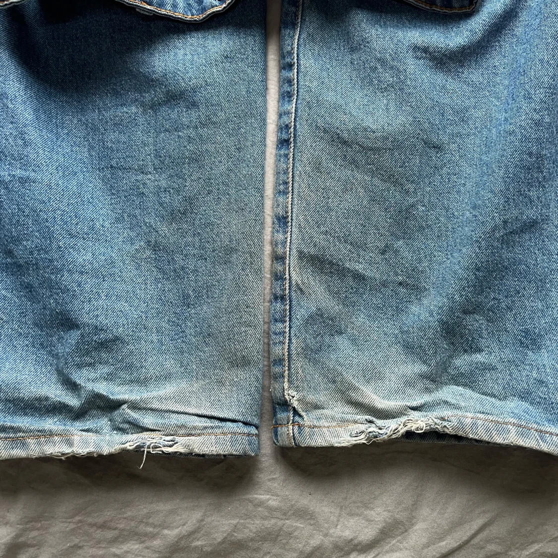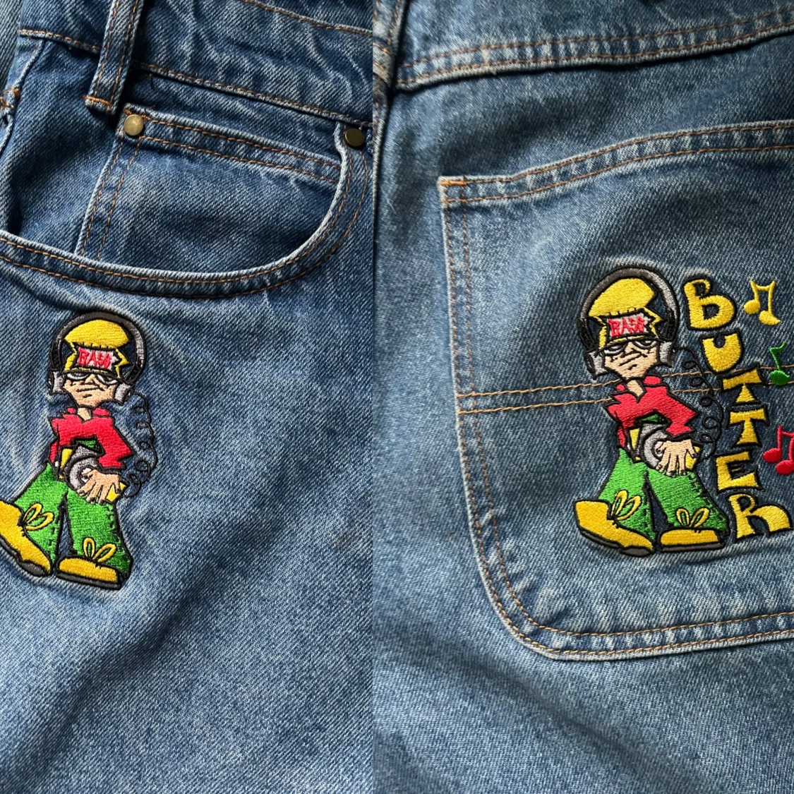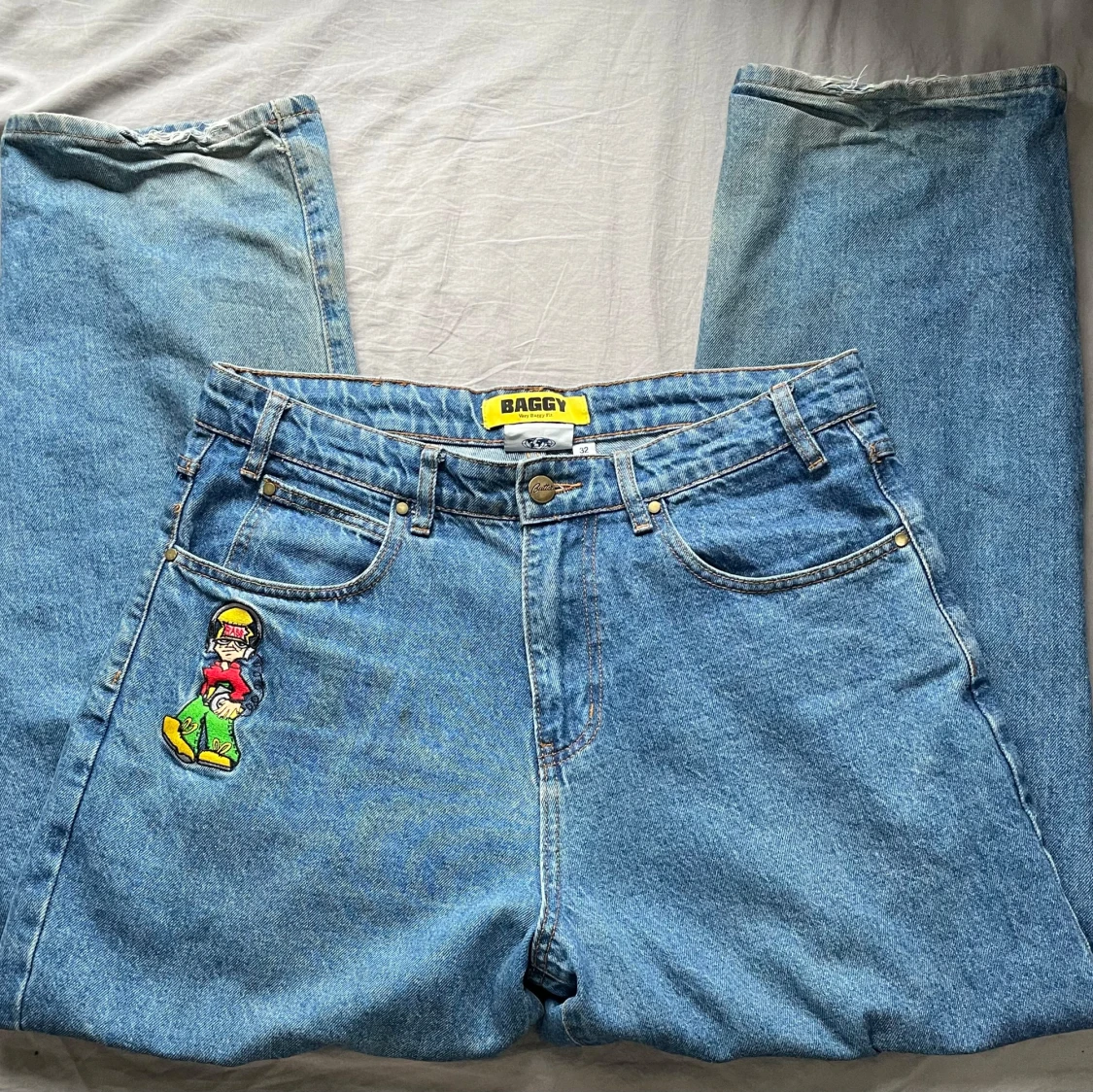 Säljer ett par Butter Goods Bass Baggy Jeans i storlek 32. Klassisk baggy passform i tvättad blå denim med broderad grafik fram (bild 3). Använda men i okej skick, lite slitage/blekning vid nederkanterna (se bild 5), annars hela och fina.