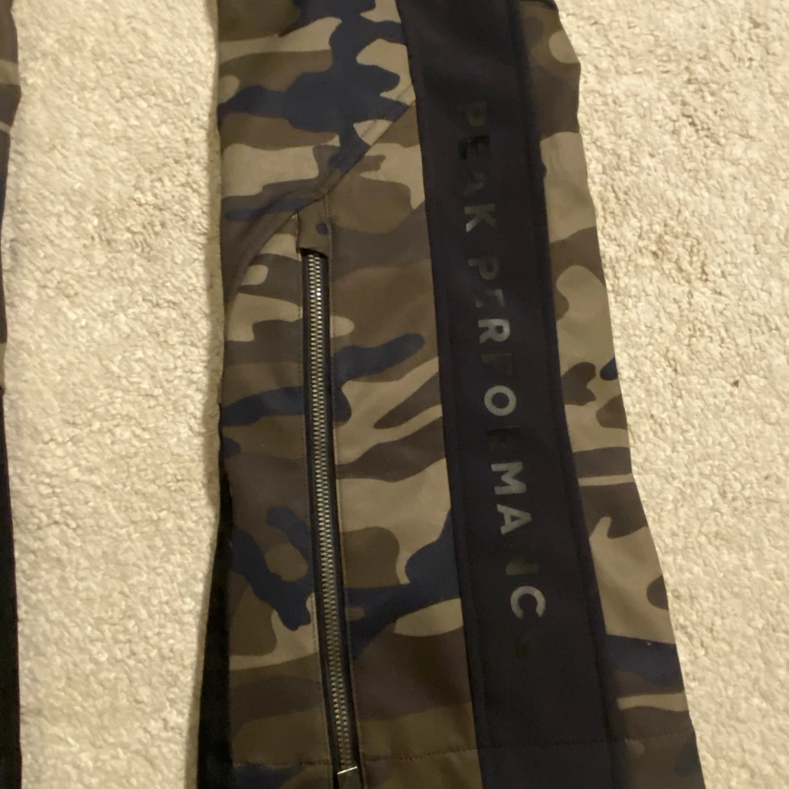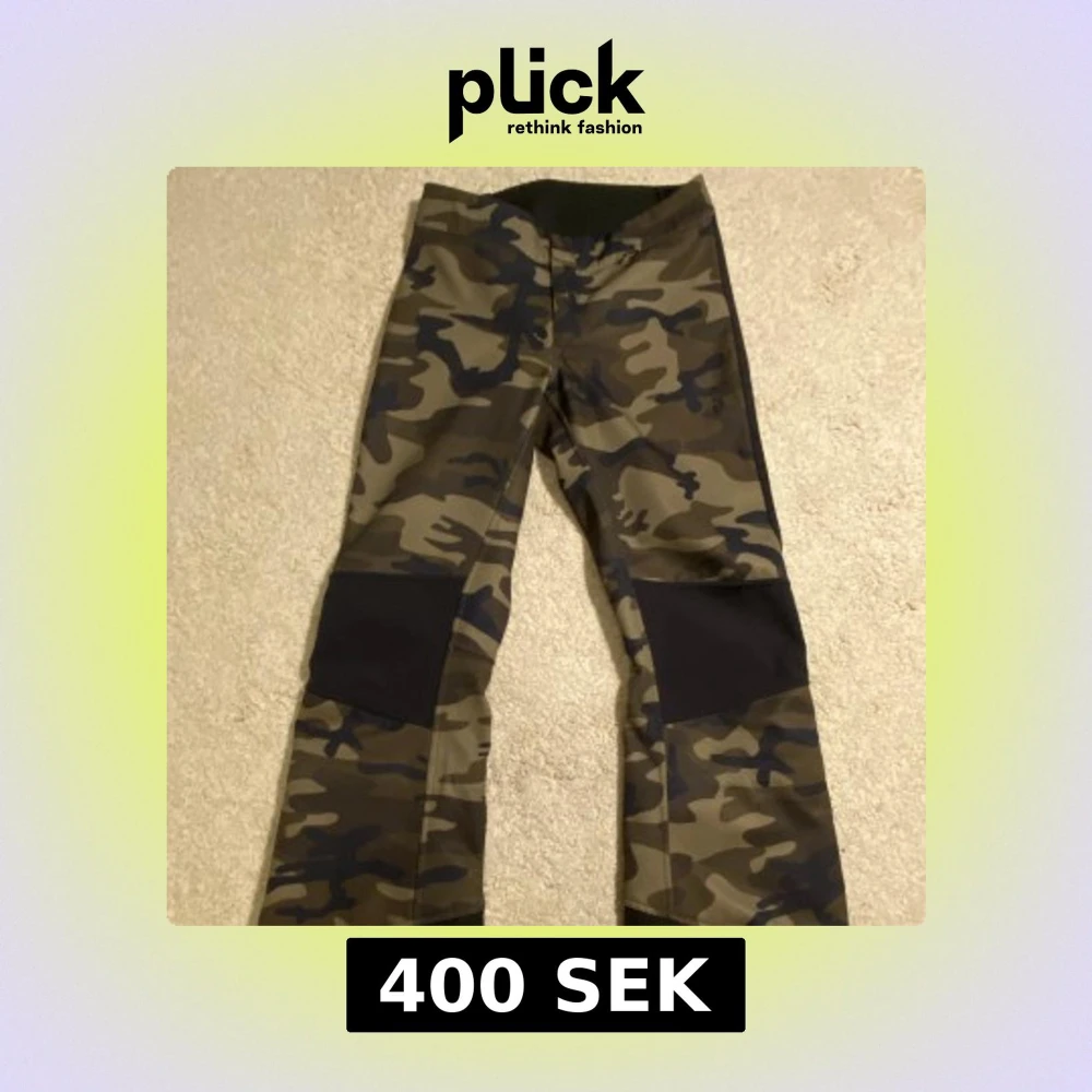 Säljer ett par täckbyxor från Peak Performance i storlek XS med camouflage-mönster i grönt och svart. Kommer inte till användning då de är för små. Täckbyxorna har en liten ficka fram och dragkedja längs ner på båda benen. Kom privat för fler frågor 💕