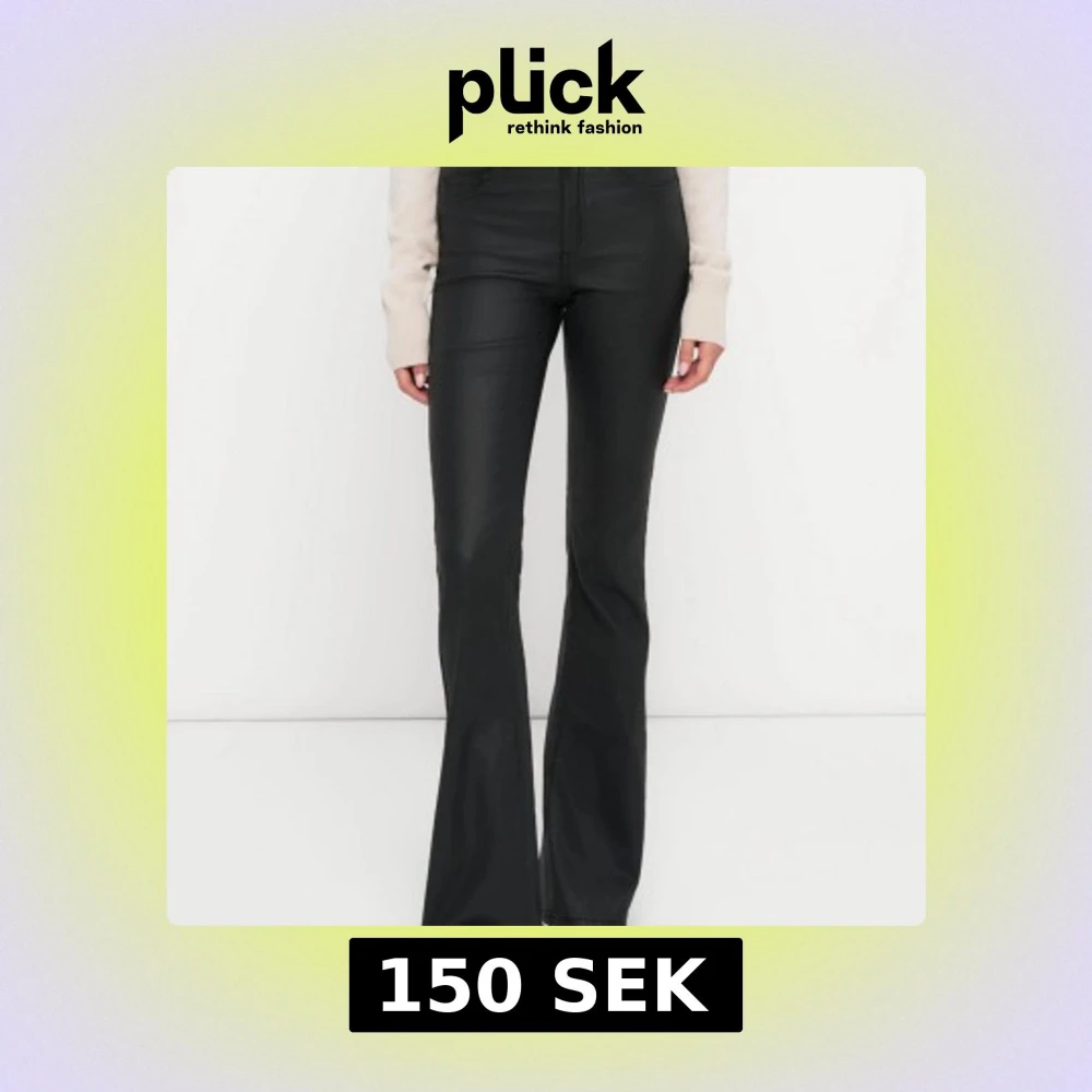 Snygga svarta byxor i skinnimitation med bootcut-ben och hög midja. Byxorna har klassiska fickor fram och bak samt bälteshällor. Perfekta för dig som vill ha en trendig och edgy look med en smickrande passform. Storlek M i midja och 34 i längd!