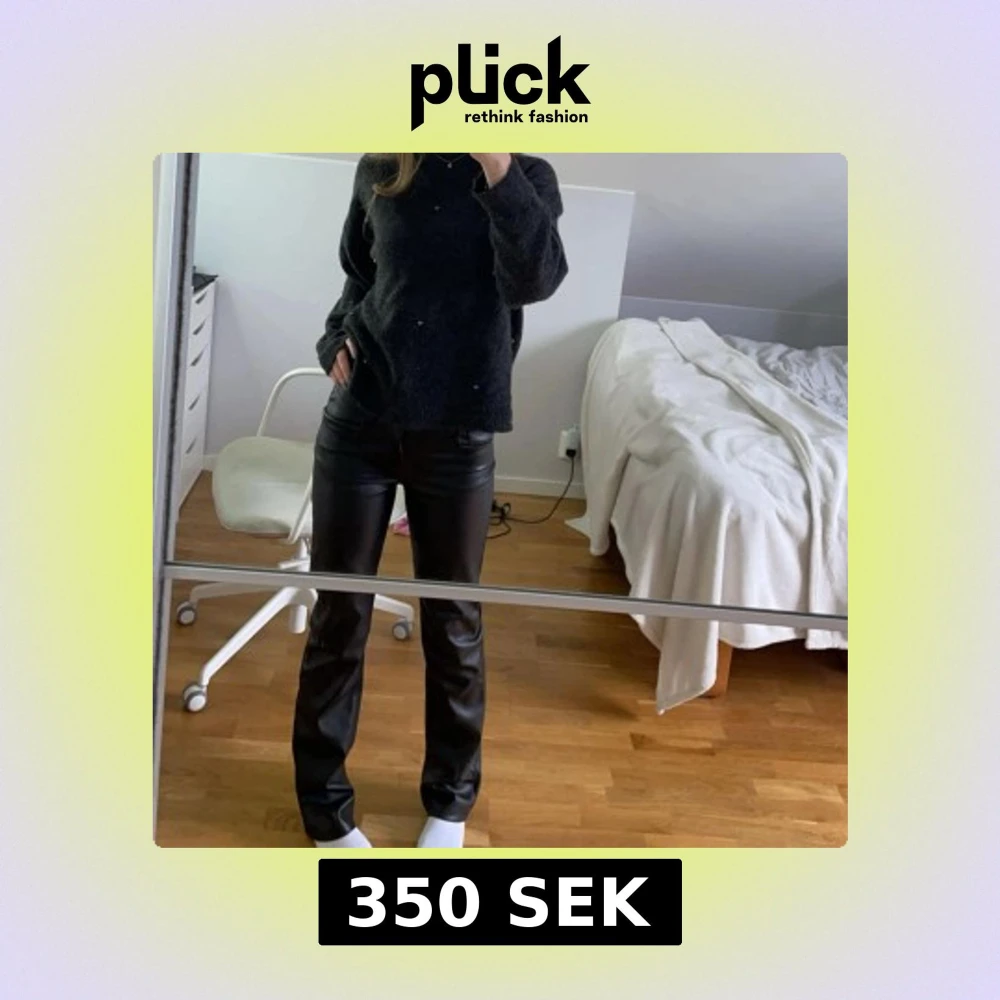 Snygga svarta skinnbyxor från BikBok. Modellen är rak med normal passform och klassiska fickor både fram och bak. Perfekta för en edgy look. Någon tråd som gått av och ett litet märke längst ner, men inget som syns vid användning. Pris kan diskuteras