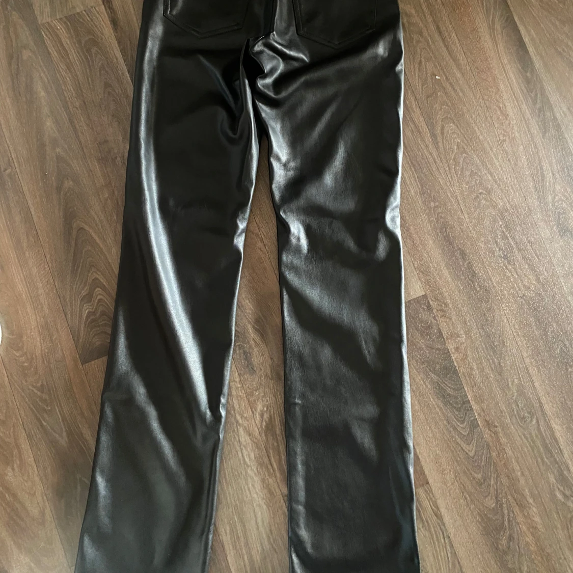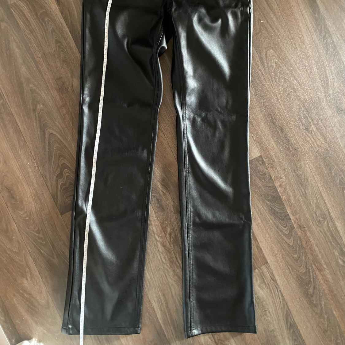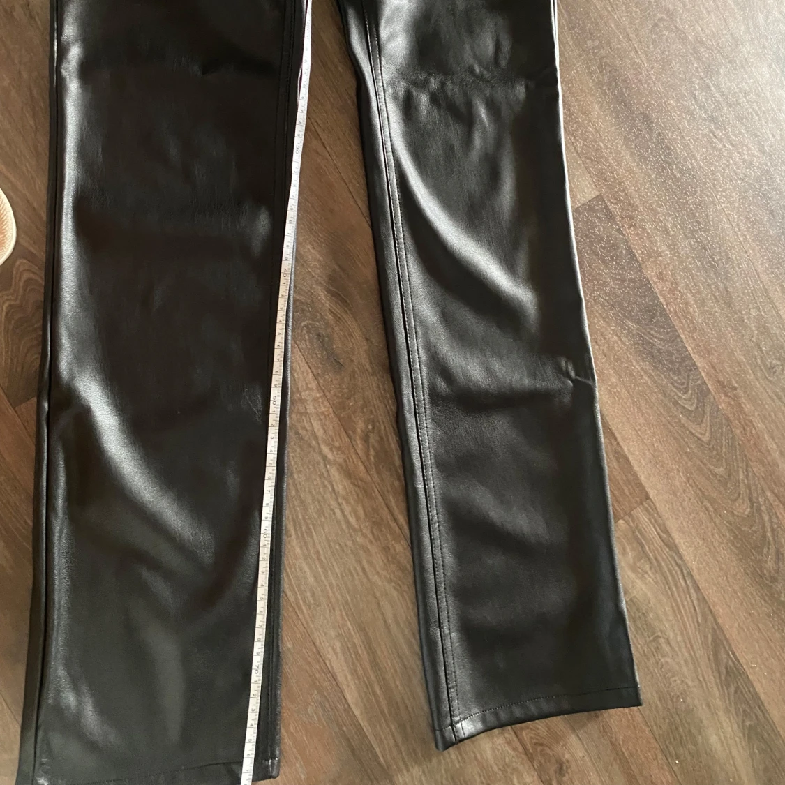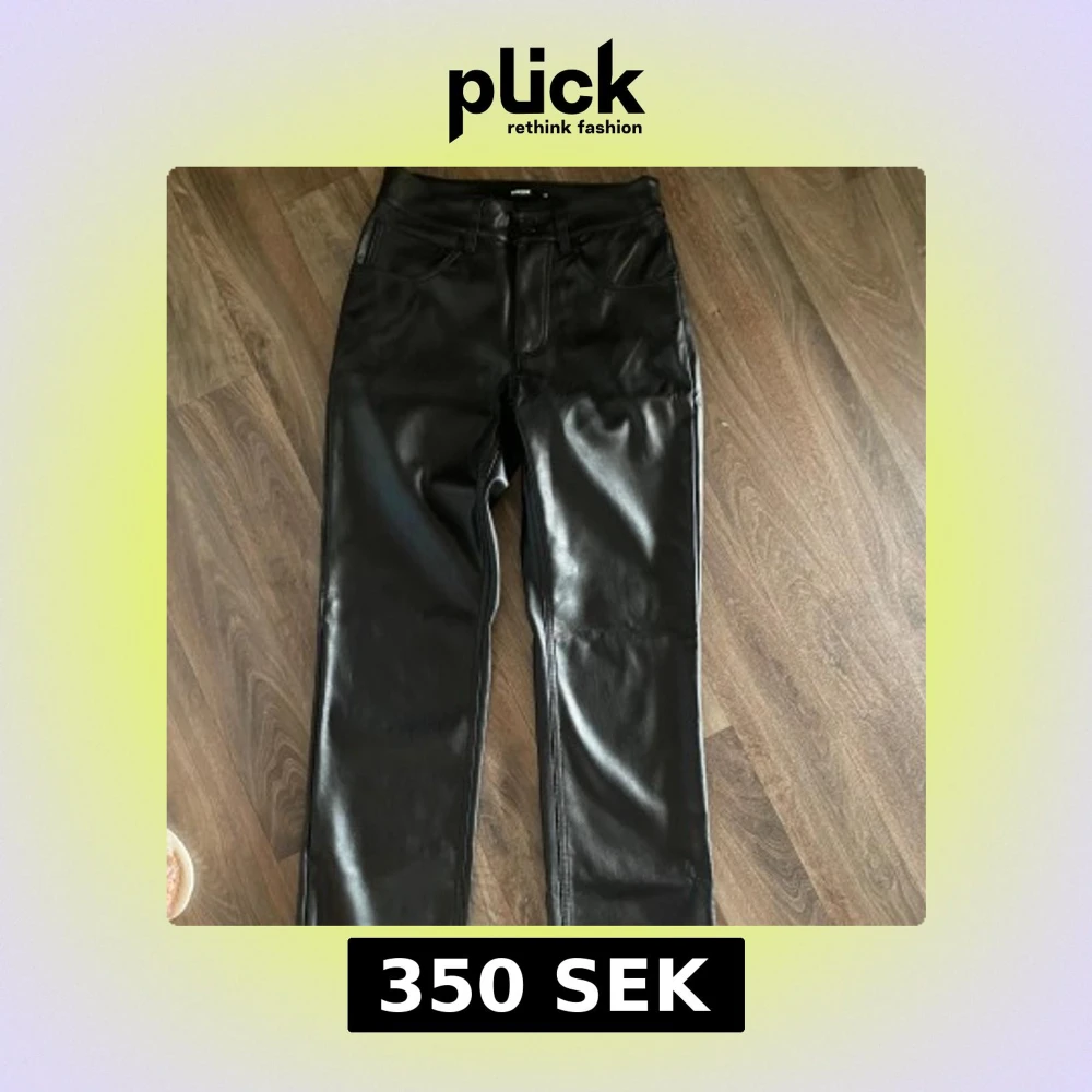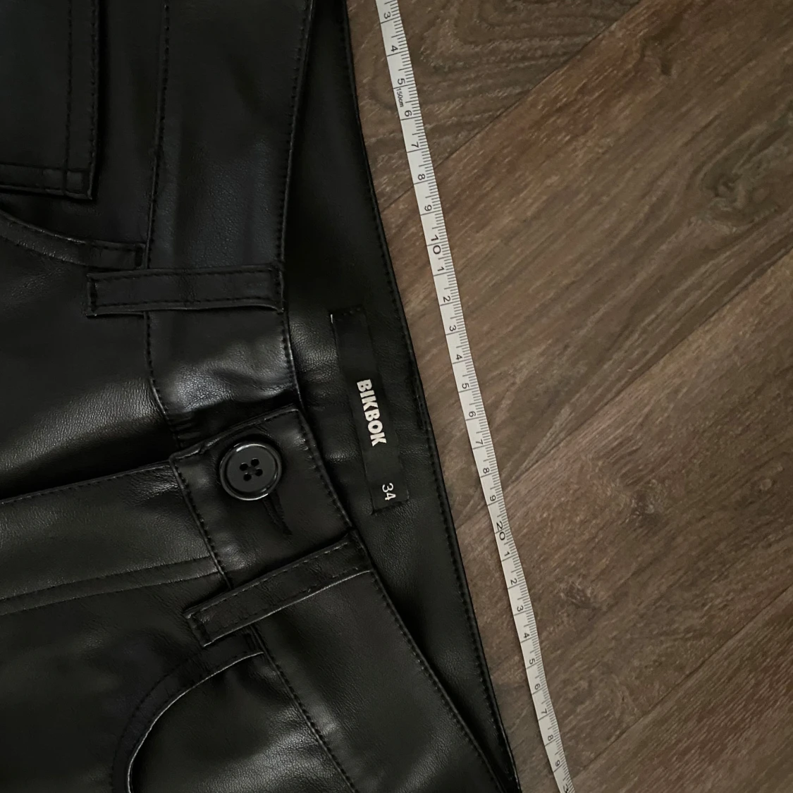 Snygga svarta byxor i skinnimitation från Bik Bok. Low waist. De har raka ben, klassisk femficksdesign och normal passform. Perfekta för dig som vill ha en edgy look med lite glansig finish. Stängs med knapp och dragkedja framtill.
