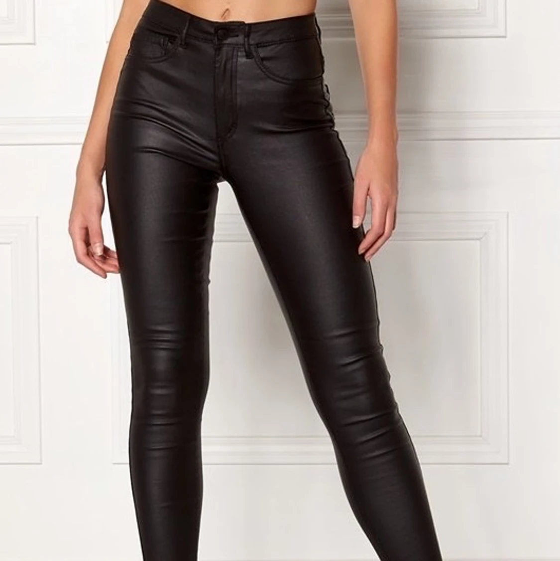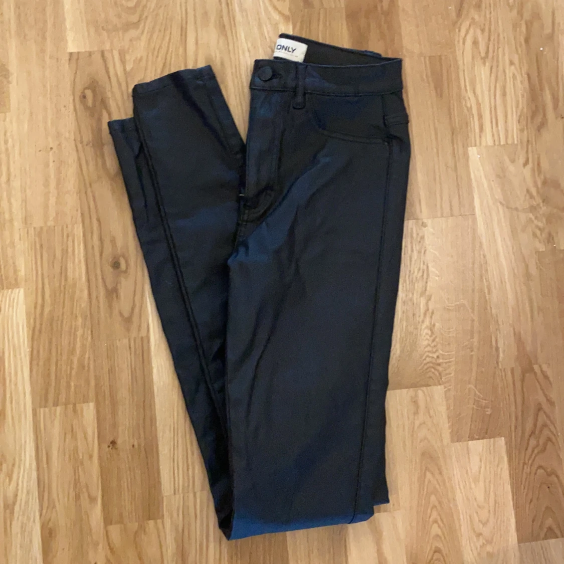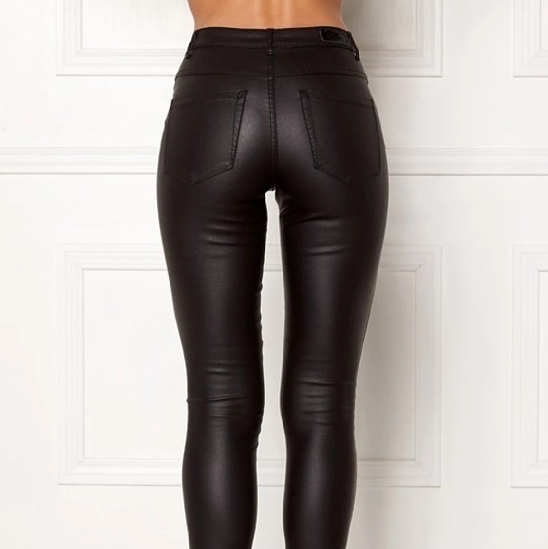 Svarta coated byxor i läderimmitation. Använda fåtal gånger så i fint skick utan skador eller fläckar. Hög midja. Smala byxben. Köparen står för fraktkostnad på 60kr.