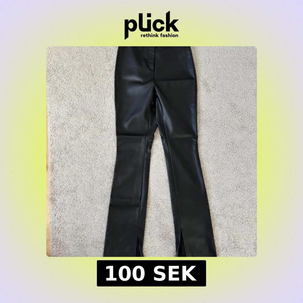 Säljer ett par svarta skinnbyxor från NA-KD i storlek 34. Byxorna har en tight passform upptill och vida ben med slits framtill. Snyggt midjehög modell som ger en trendig look. Perfekta till sneakers eller klackar.